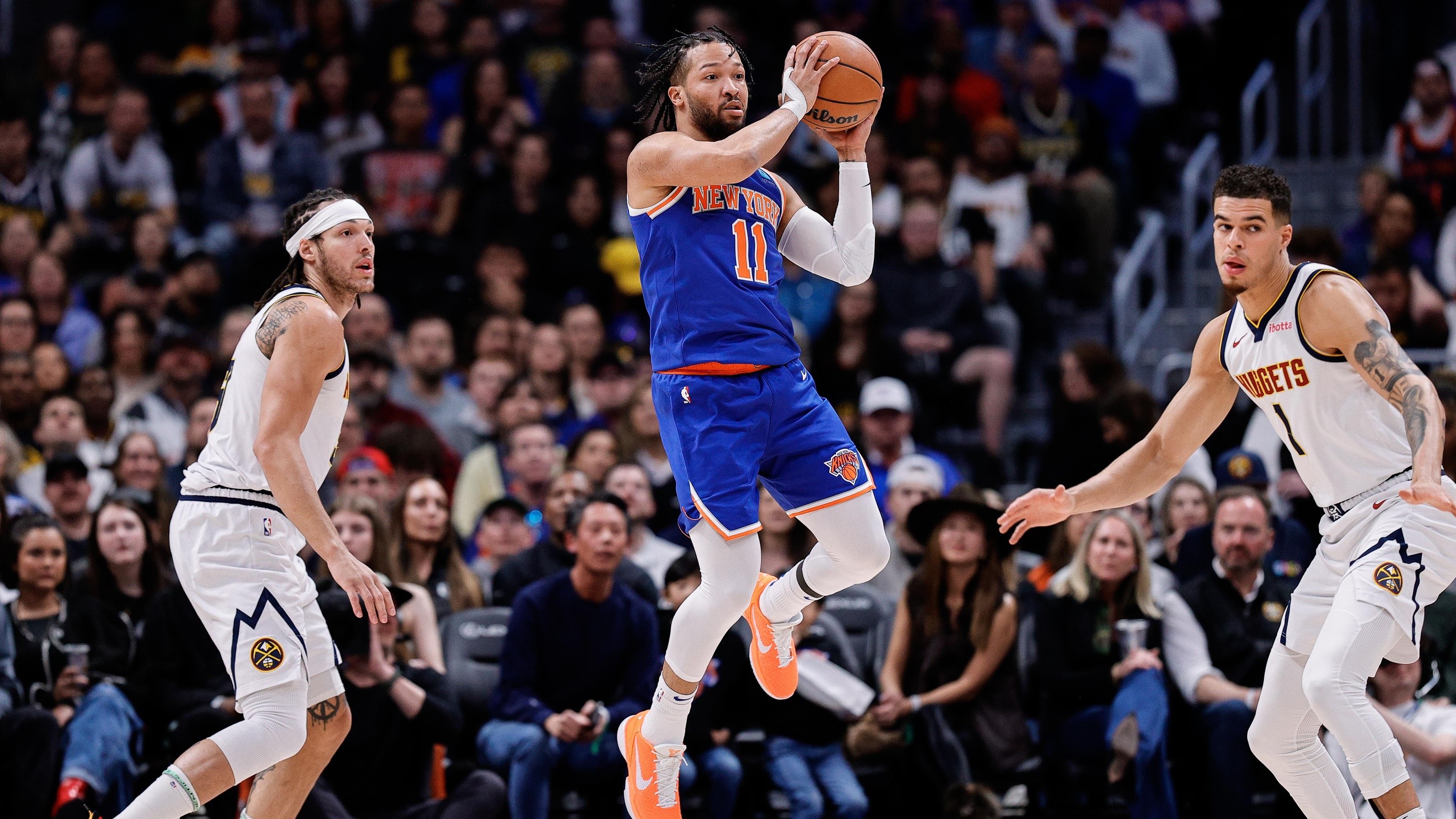 Mar 21, 2024; Denver, Colorado, USA; New York Knicks guard Jalen Brunson (11) controls the ball as Denver Nuggets forward Aaron Gordon (50) and ]forward Michael Porter Jr. (1) defend in the first quarter at Ball Arena. / Isaiah J. Downing-USA TODAY Sports