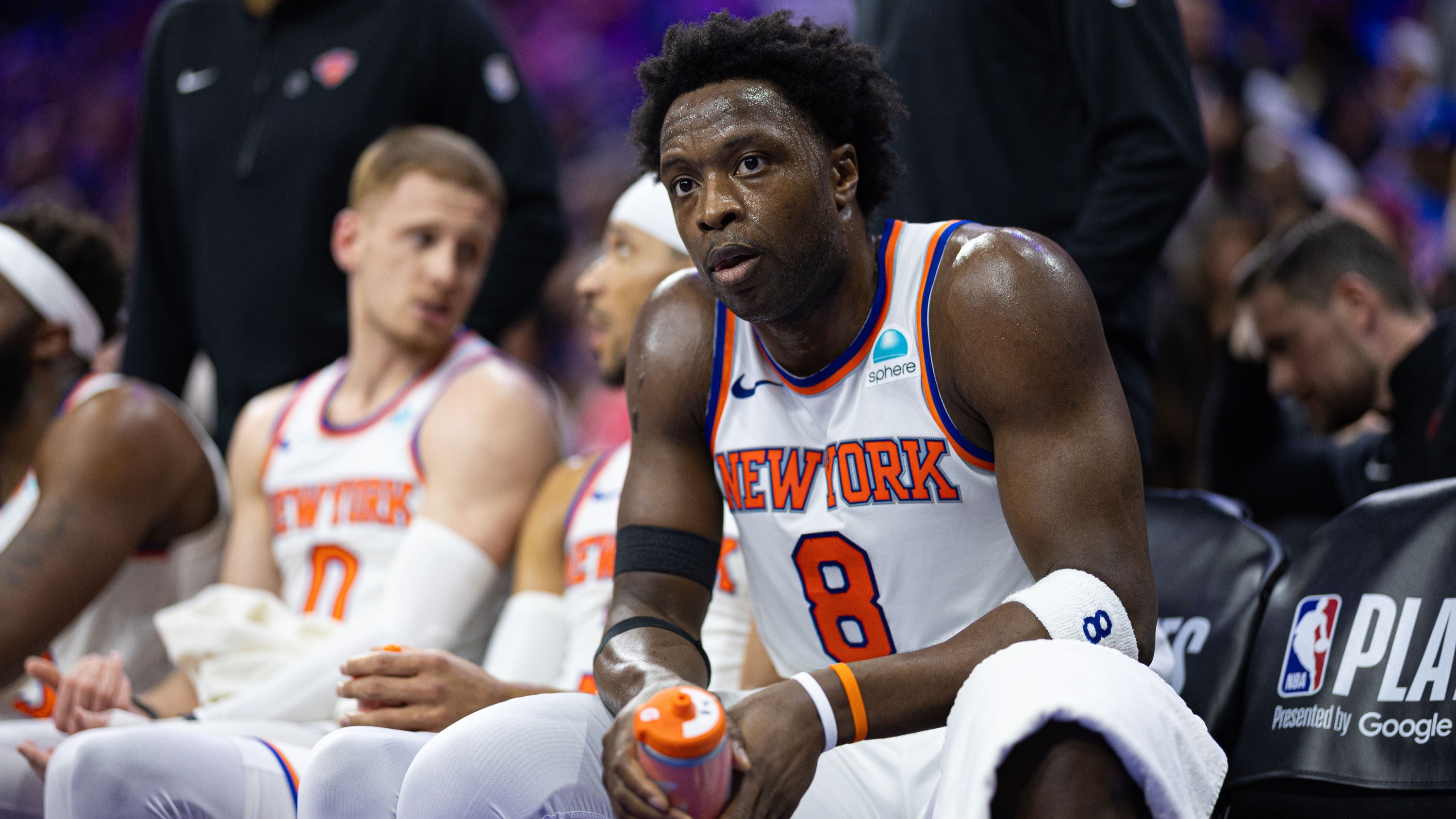 May 2, 2024; Philadelphia, Pennsylvania, USA; New York Knicks forward OG Anunoby (8) looks on from the bench during a timeout in the first half against the Philadelphia 76ers in game six of the first round for the 2024 NBA playoffs at Wells Fargo Center. / Bill Streicher-USA TODAY Sports