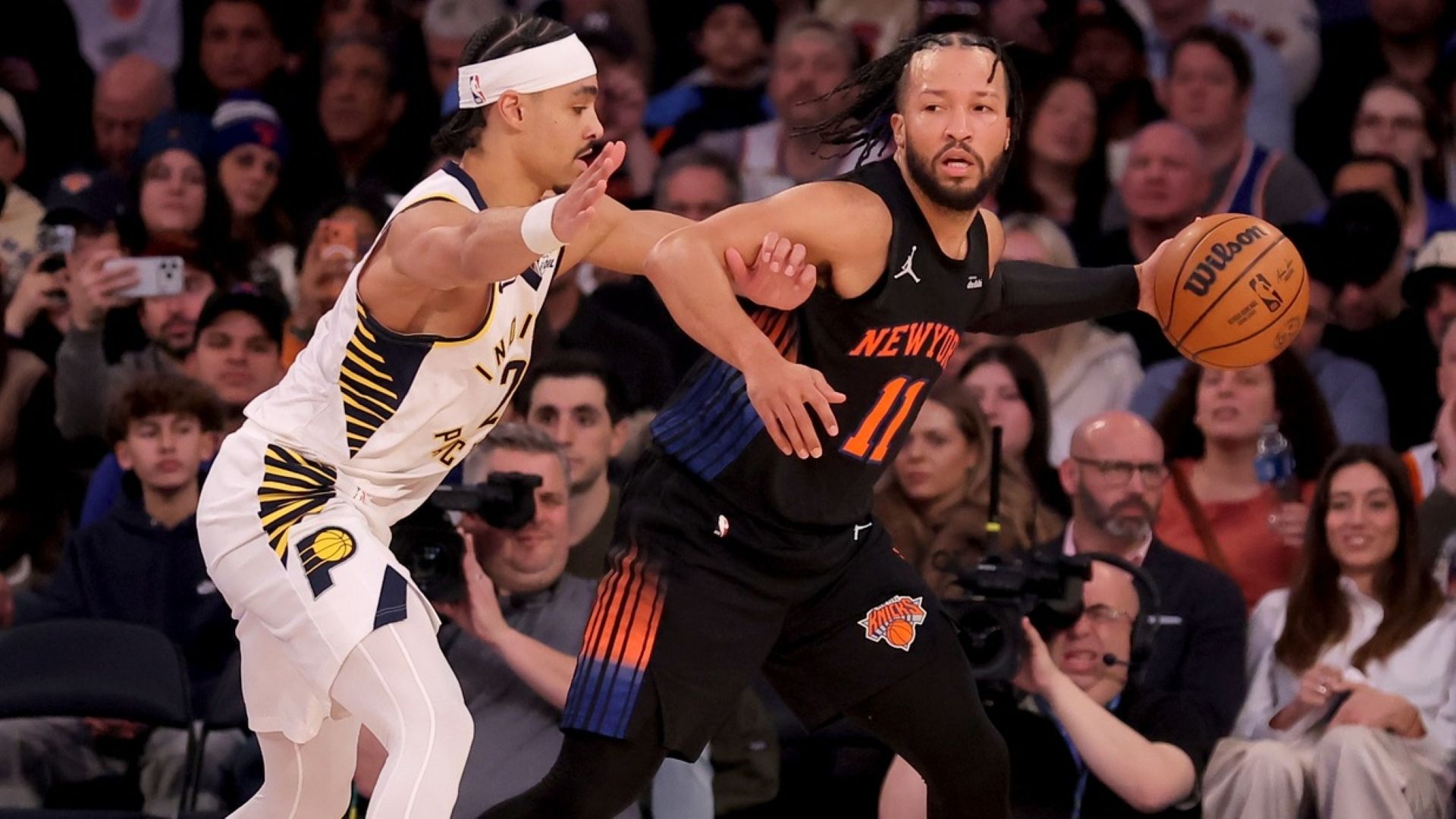 Despite Jalen Brunson's 40 points, Knicks come up short in 137-134 OT loss to PacersThe 39 lead changes were the most in an NBA game this season2/11/2026, 3:44 AMColin MartinFreelance Editorial ProducerFeb 10, 2026; New York, New York, USA; New York Knicks guard Jalen Brunson (11) controls the ball against Indiana Pacers guard Andrew Nembhard (2) during the first quarter at Madison Square Garden. / Brad Penner-Imagn Images