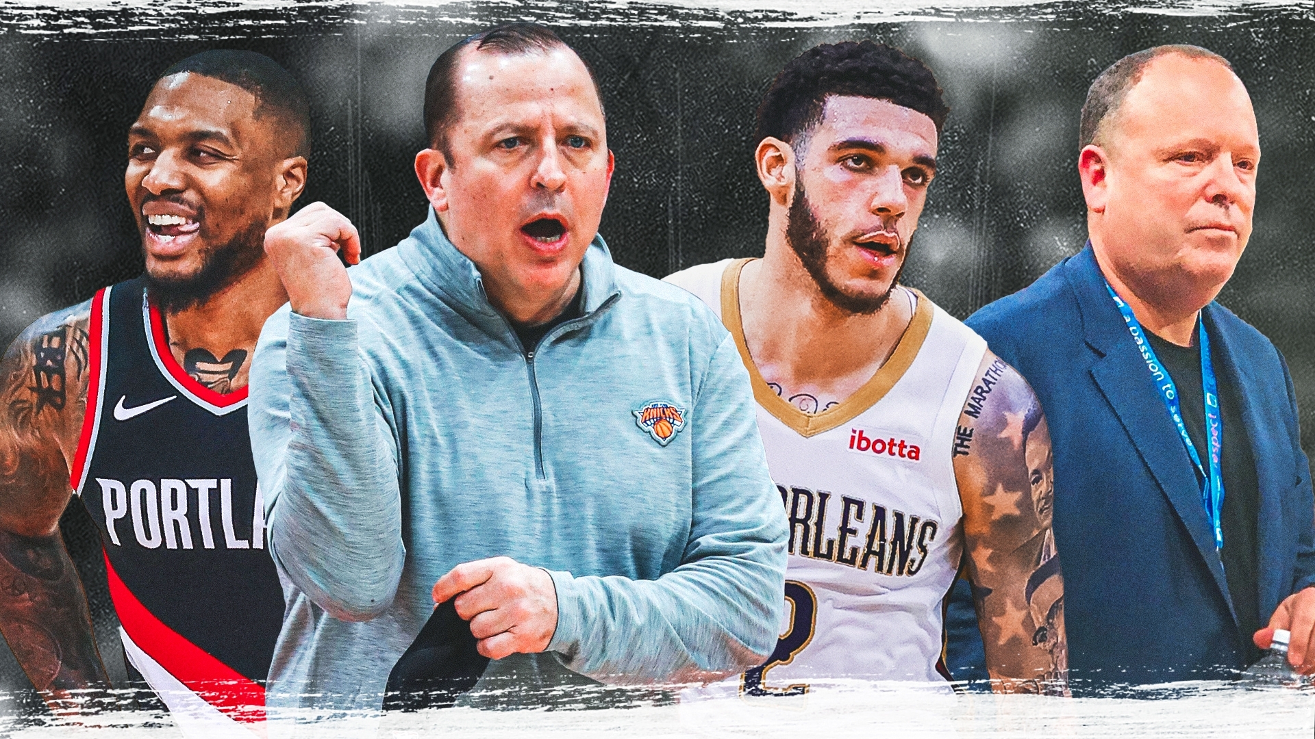 Damian Lillard, Tom Thibodeau, Lonzo Ball and Leon Rose / USA TODAY Sports/SNY Treated Image