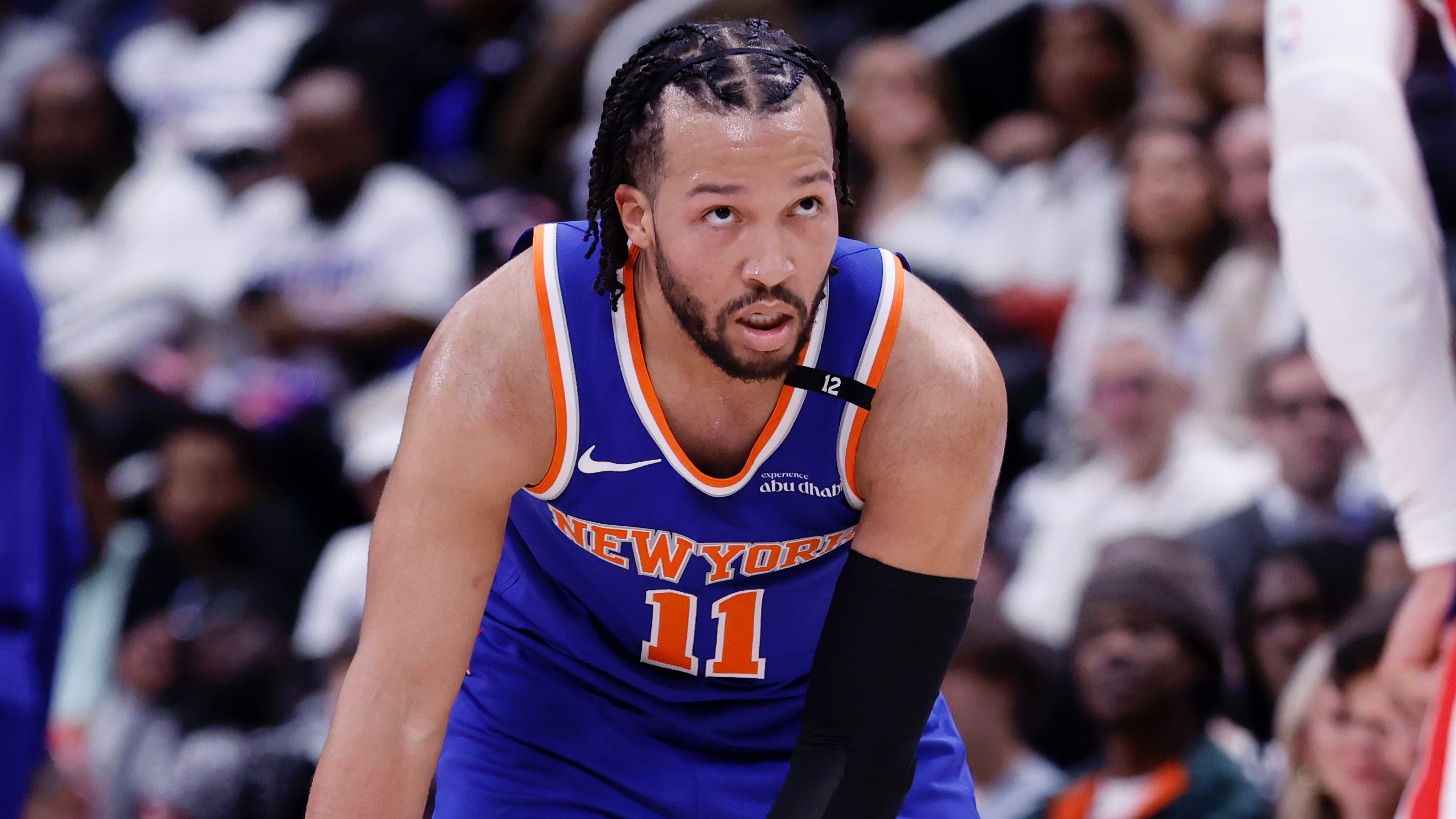 May 1, 2025; Detroit, Michigan, USA; New York Knicks guard Jalen Brunson (11) shoots on Detroit Pistons forward Ausar Thompson (9) in the second half during game six of first round for the 2024 NBA Playoffs at Little Caesars Arena. / Rick Osentoski - Imagn Images