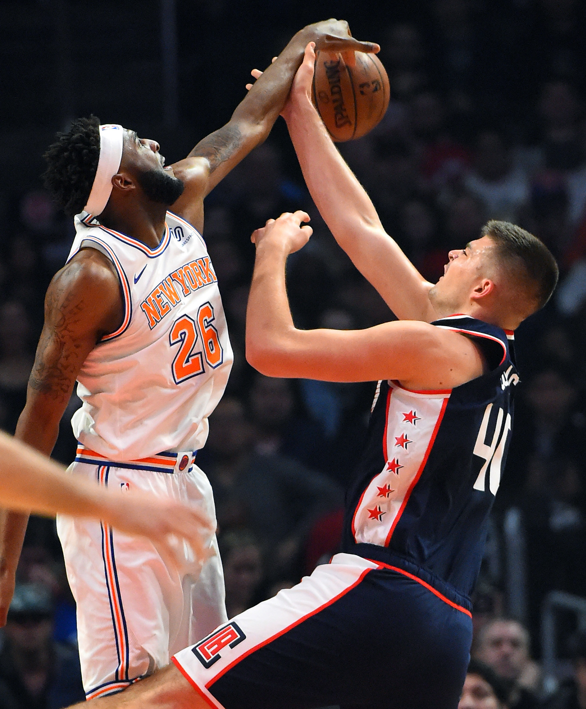 New York Knicks center Mitchell Robinson blocks a shot by Los Angeles Clippers center Ivica Zubac in the first half of the game at Staples Center. / Jayne Kamin-Oncea/USA TODAY Sports