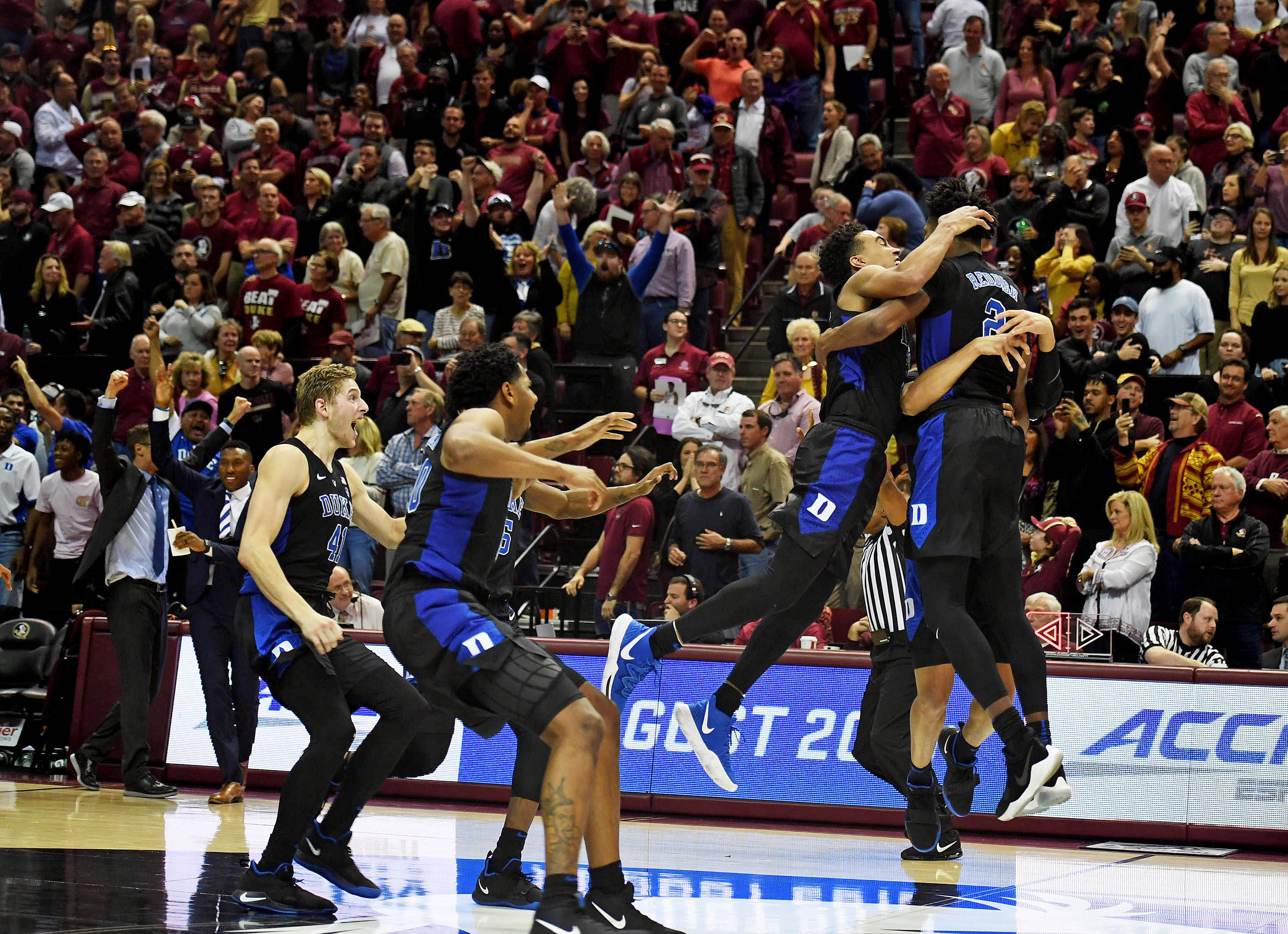 Jan 12, 2019; Tallahassee, FL, USA; Duke Blue Devils players celebrate after winning the game against the Florida State Seminoles at Donald L. Tucker Center. Mandatory Credit: Melina Myers-USA TODAY Sports / Melina Myers