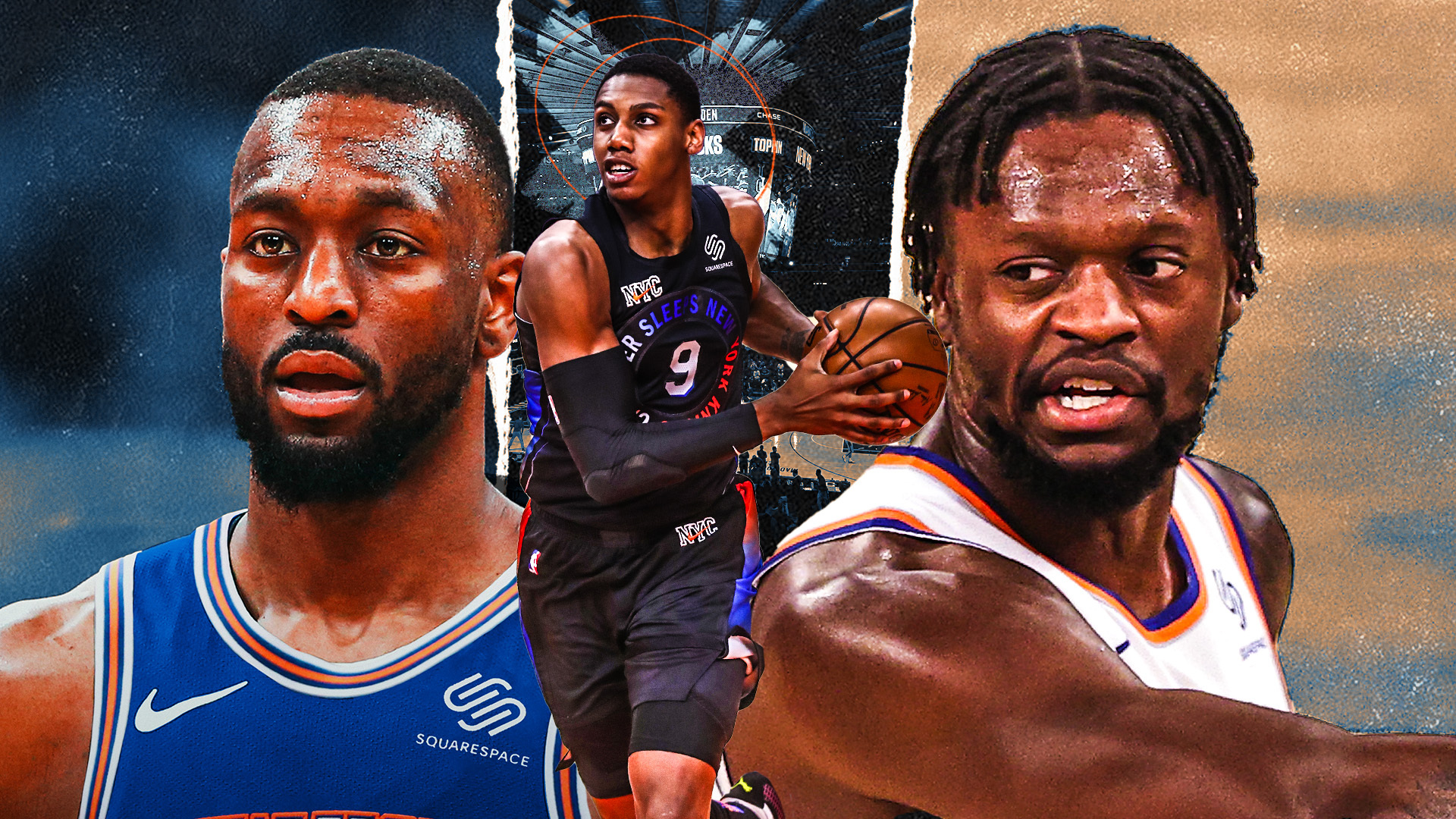 New York Knicks forward Obi Toppin (1) celebrates with New York Knicks guard Elfrid Payton (6) and guard Miles McBride (2), and guard Immanuel Quickley (5) after scoring against the Los Angeles Lakers / Stephen R. Sylvanie-USA TODAY Sports
