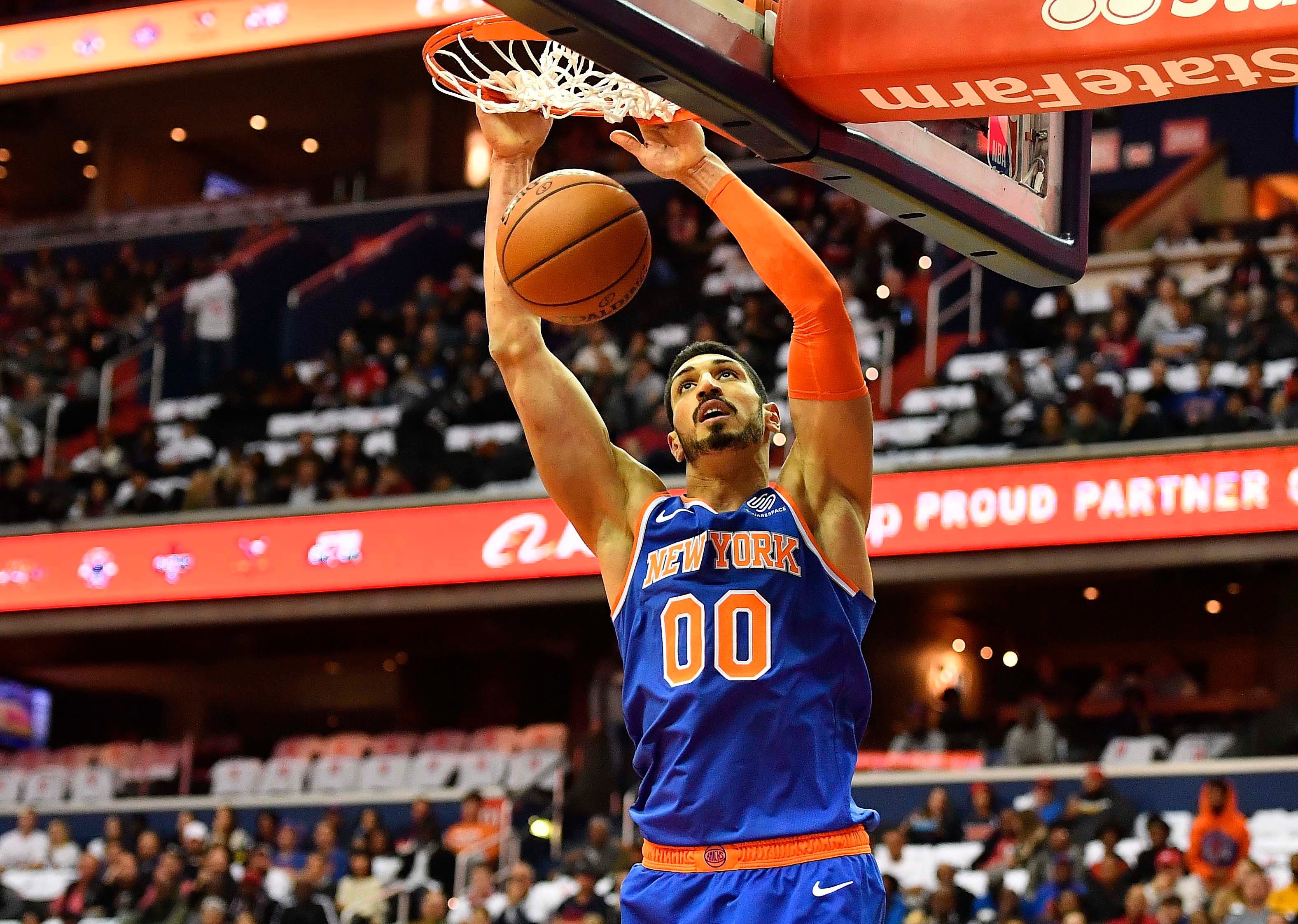 Nov 4, 2018; Washington, DC, USA; New York Knicks center Enes Kanter (00) dunks the ball against the Washington Wizards during the first half at Capital One Arena. Mandatory Credit: Brad Mills-USA TODAY Sports / Brad Mills