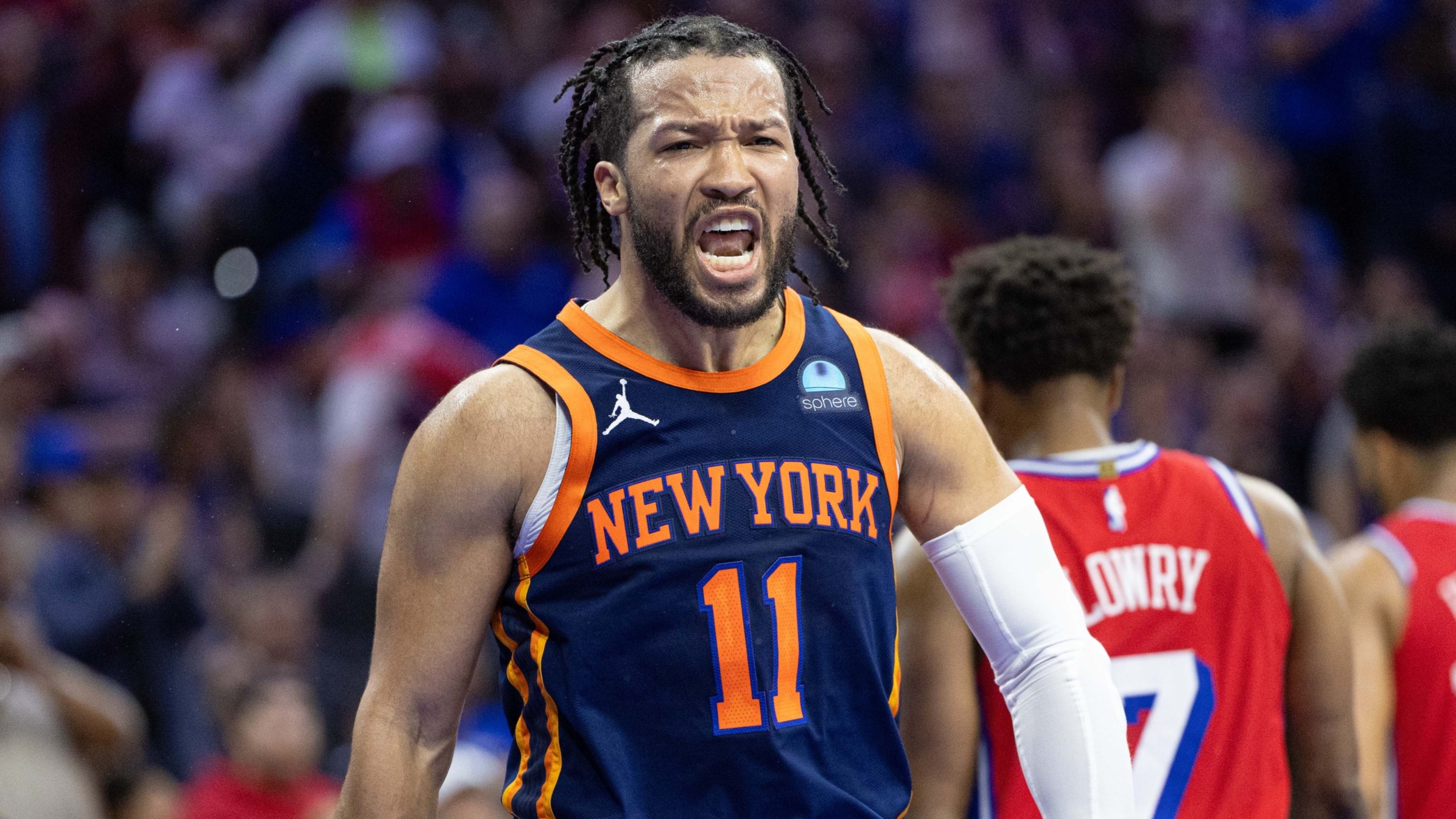 Apr 28, 2024; Philadelphia, Pennsylvania, USA; New York Knicks guard Jalen Brunson (11) reacts after scoring against the Philadelphia 76ers during the fourth quarter of game four of the first round in the 2024 NBA playoffs at Wells Fargo Center. / Bill Streicher-USA TODAY Sports