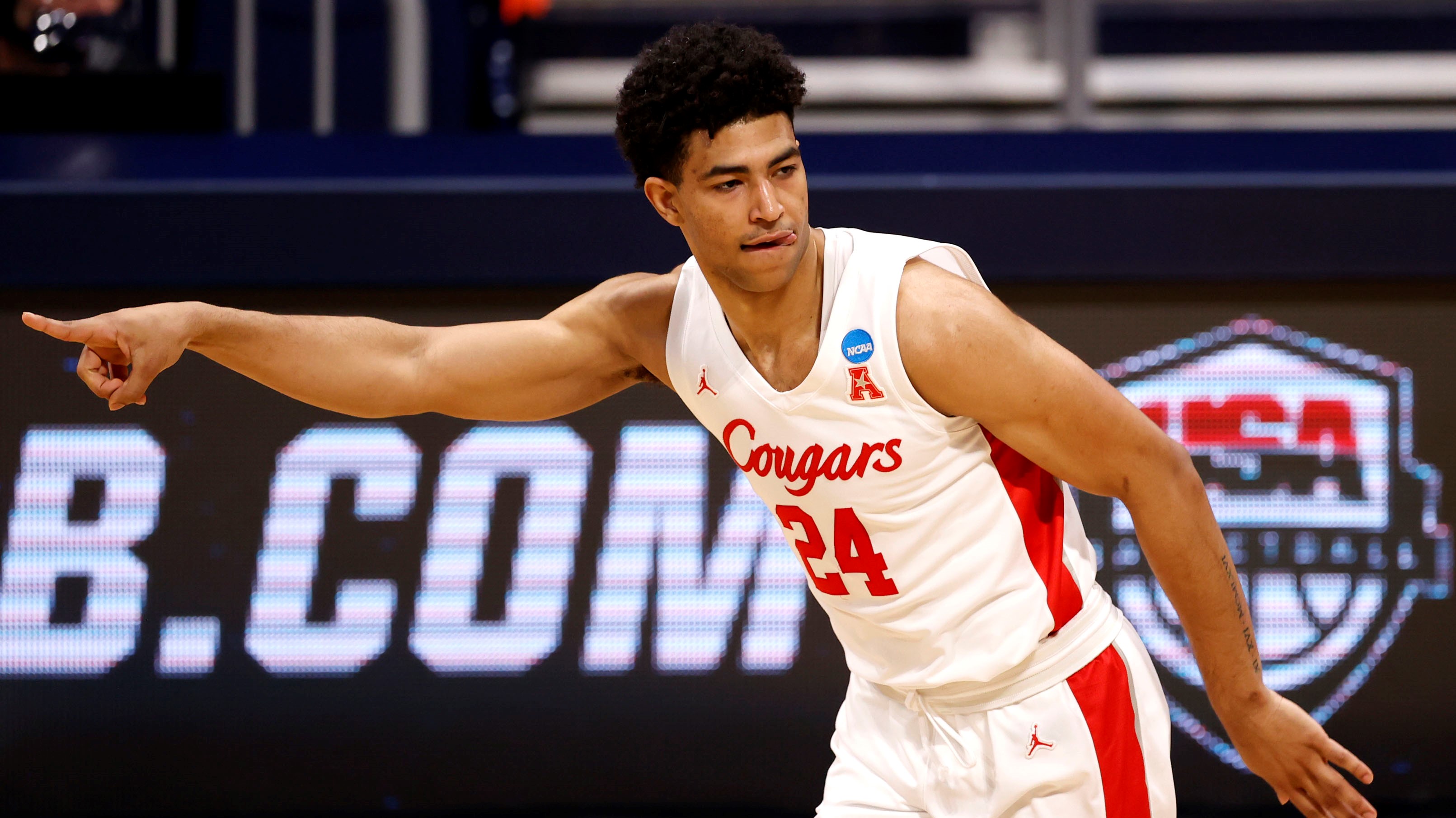 Houston Cougars guard Quentin Grimes (24) points after sinking a three-pointer against Syracuse during the Sweet Sixteen round of the 2021 NCAA Tournament on Saturday, March 27, 2021, at Hinkle Fieldhouse in Indianapolis, Ind. Mandatory Credit: Albert Cesare/IndyStar via USA TODAY Sports / Albert Cesare/IndyStar via USA TODAY Sports