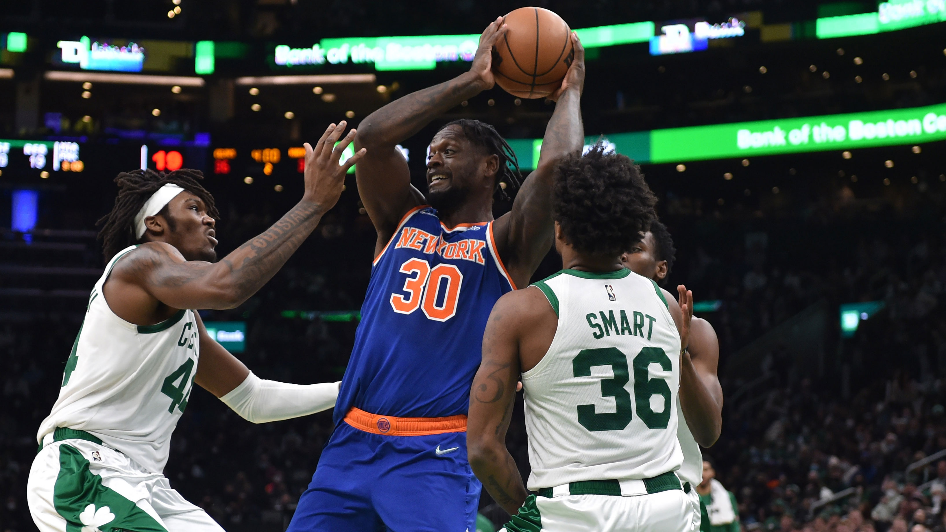 Jan 8, 2022; Boston, Massachusetts, USA; New York Knicks forward Julius Randle (30) controls the ball against Boston Celtics center Robert Williams III (44) and guard Marcus Smart (36) during the first half at TD Garden. / Bob DeChiara-USA TODAY Sports