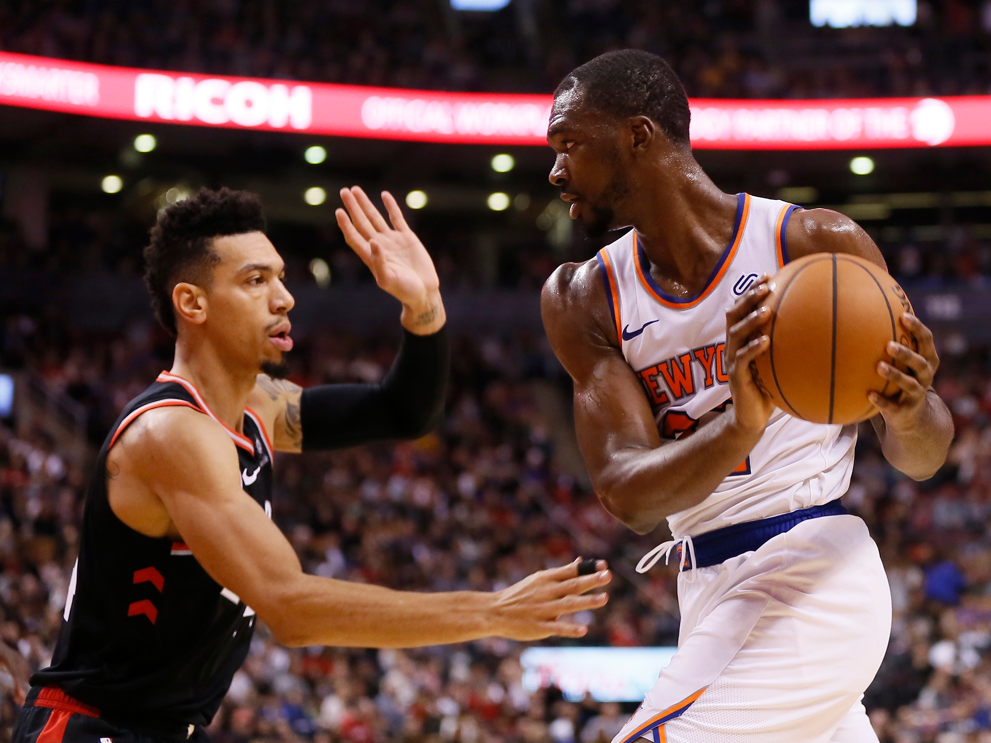Nov 10, 2018; Toronto, Ontario, CAN; New York Knicks forward Noah Vonleh (right) controls the ball against Toronto Raptors guard Danny Green (left) during the first half at Scotiabank Arena. Mandatory Credit: John E. Sokolowski-USA TODAY Sports / John E. Sokolowski