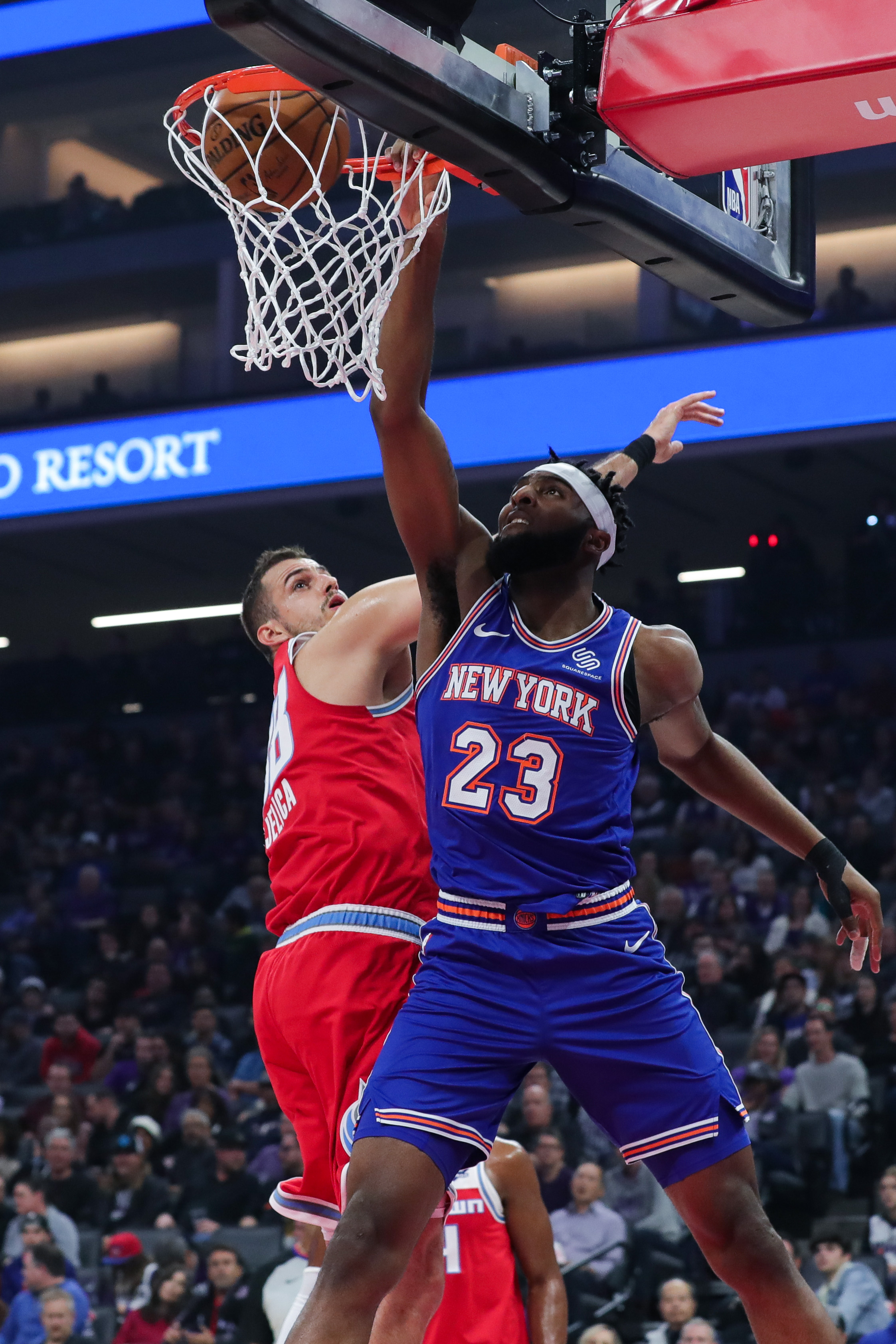 Dec 13, 2019; Sacramento, CA, USA; New York Knicks center Mitchell Robinson (23) dunks the ball over Sacramento Kings forward Nemanja Bjelica (88) during the first quarter at Golden 1 Center. Mandatory Credit: Sergio Estrada-USA TODAY Sports / Sergio Estrada