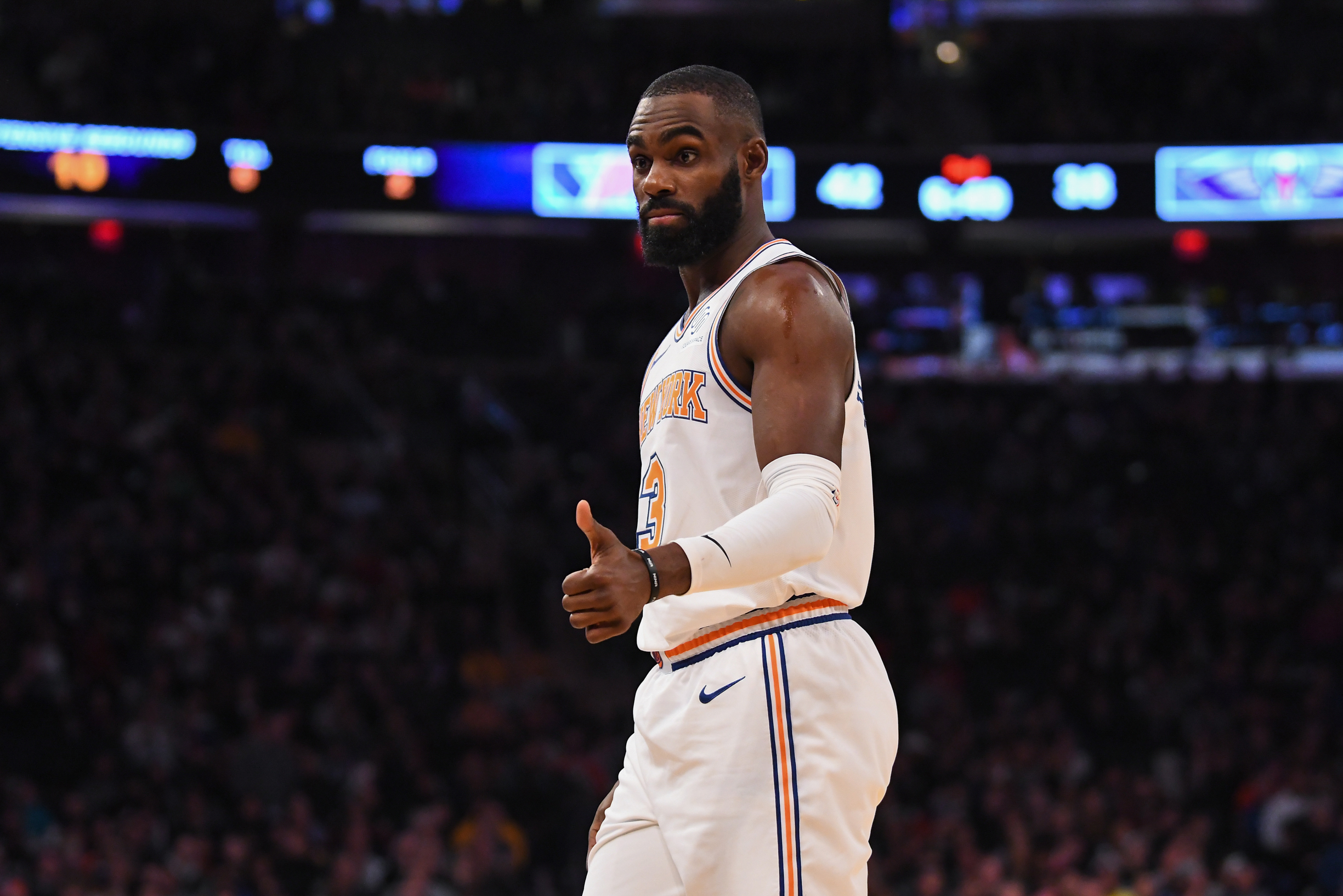Nov 23, 2018; New York, NY, USA; New York Knicks guard Tim Hardaway Jr. (3) reacts in the second quarter agains the New Orleans Pelicans at Madison Square Garden. Mandatory Credit: Catalina Fragoso-USA TODAY Sports / Catalina Fragoso