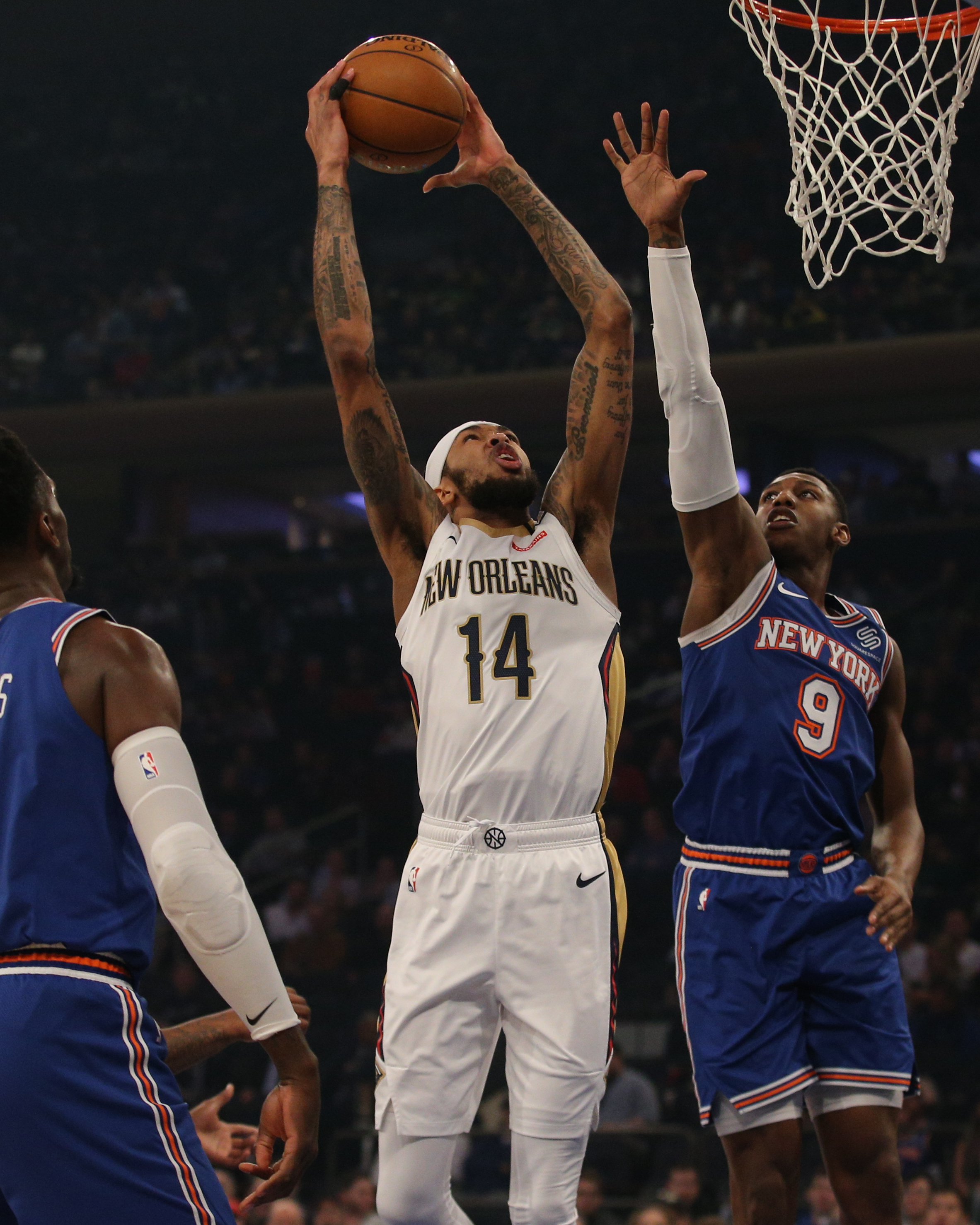 Jan 10, 2020; New York, New York, USA; New Orleans Pelicans small forward Brandon Ingram (14) drives to the basket against New York Knicks power forward Bobby Portis (1) and shooting guard RJ Barrett (9) during the first quarter at Madison Square Garden. Mandatory Credit: Brad Penner-USA TODAY Sportsundefined