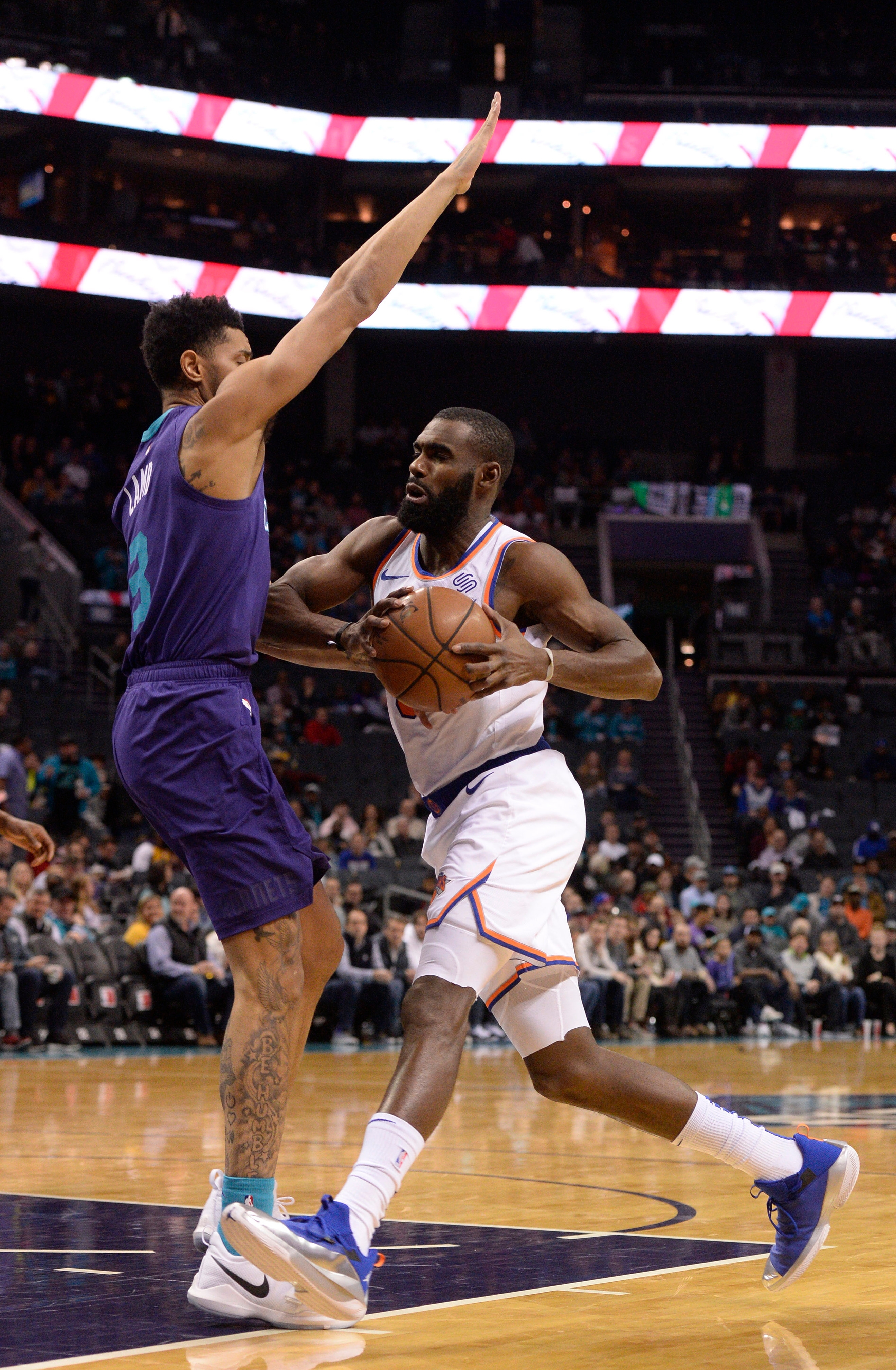 New York Knicks guard forward Tim Hardaway Jr. drives against Charlotte Hornets guard forward Jeremy Lamb during the first half at the Spectrum Center. / Sam Sharpe/USA TODAY Sports