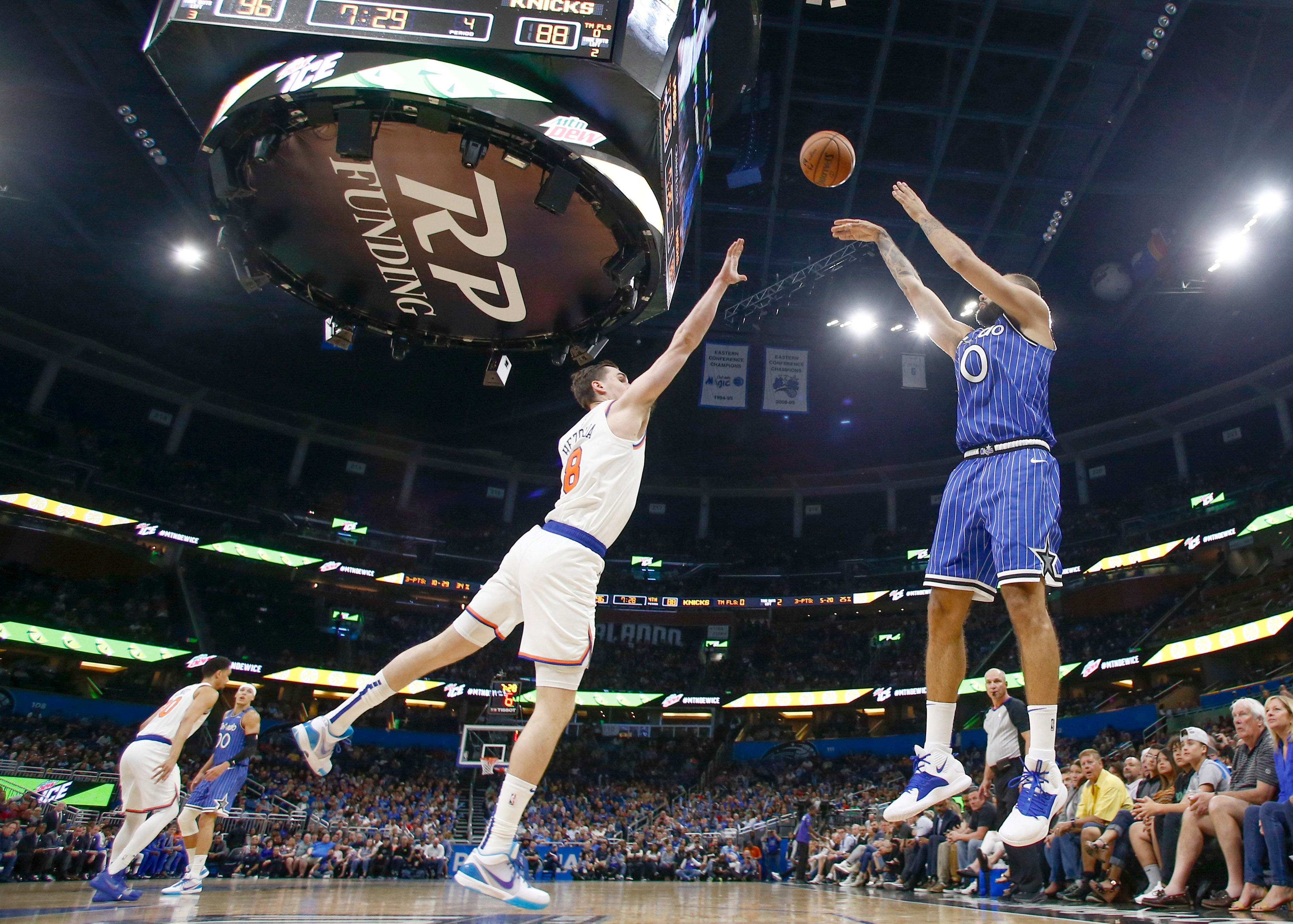 Apr 3, 2019; Orlando, FL, USA; Orlando Magic guard Evan Fournier (10) shoots a three point shot over New York Knicks forward Mario Hezonja (8) during the second half at Amway Center. Mandatory Credit: Reinhold Matay-USA TODAY Sports / Reinhold Matay