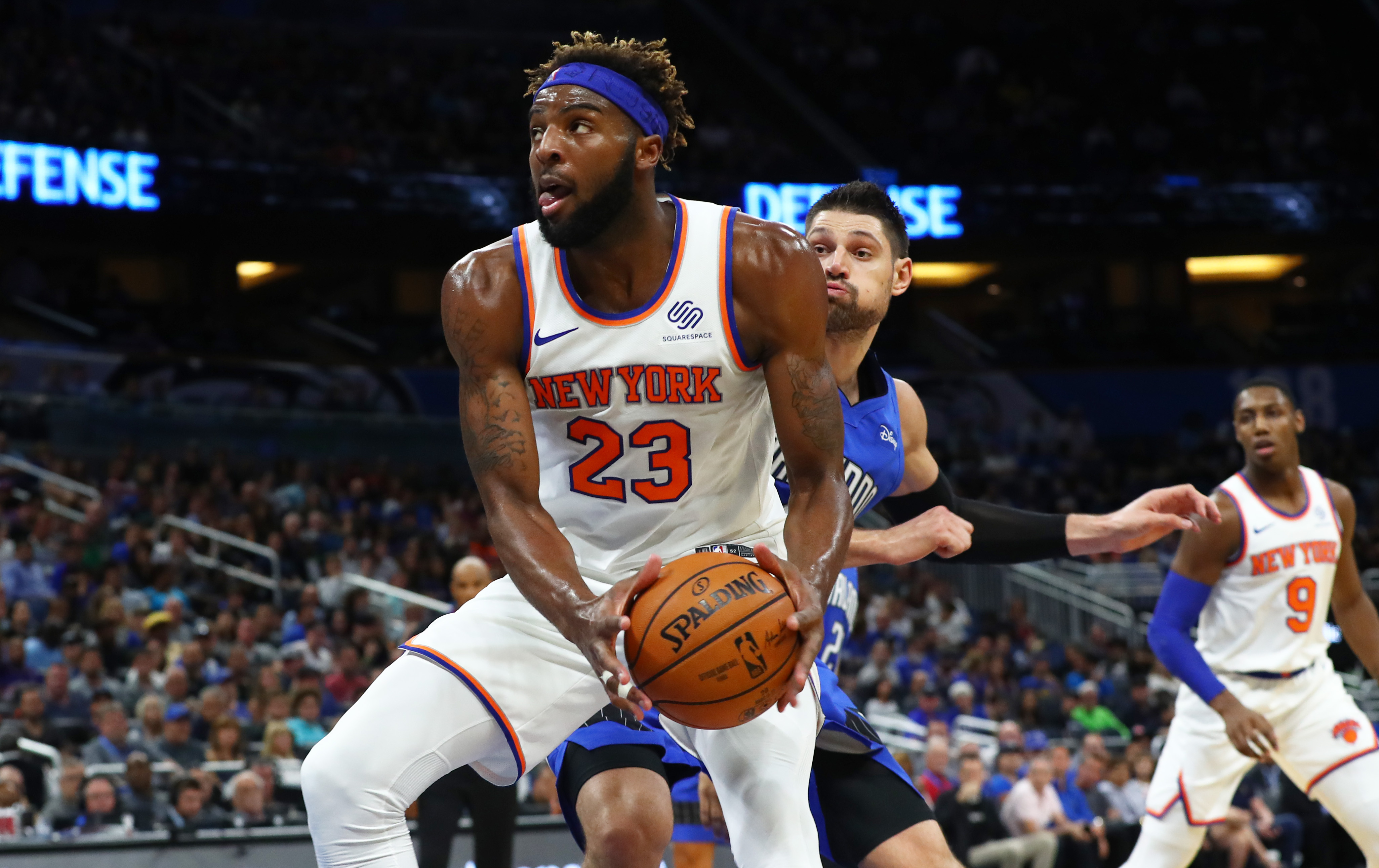 Oct 30, 2019; Orlando, FL, USA; New York Knicks center Mitchell Robinson (23) drives past Orlando Magic center Nikola Vucevic (9) and shoots a layup during the second quarter at Amway Center. Mandatory Credit: Kim Klement-USA TODAY Sports / Kim Klement