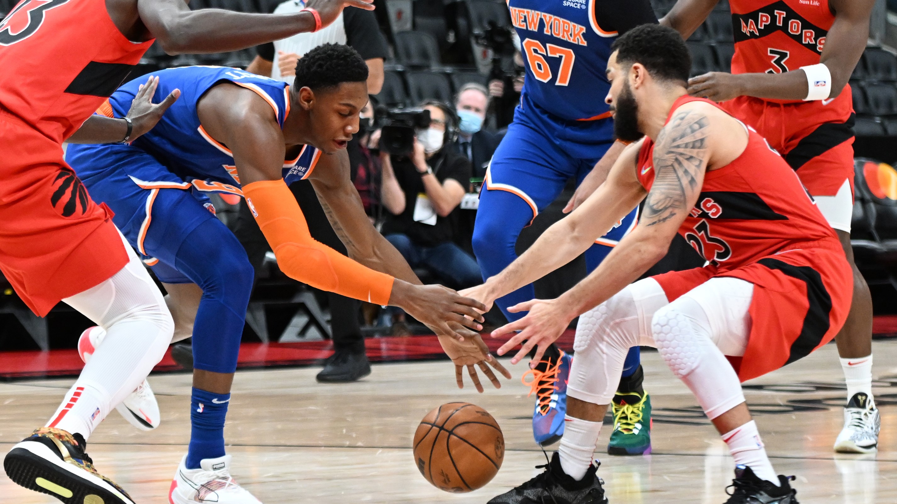 Jan 2, 2022; Toronto, Ontario, CAN; Toronto Raptors guard Fred VanVleet (23) battles for a loose ball with New York Knicks guard RJ Barrett (9) in the first half at Scotiabank Arena. Mandatory Credit: Dan Hamilton-USA TODAY Sports / Dan Hamilton-USA TODAY Sports