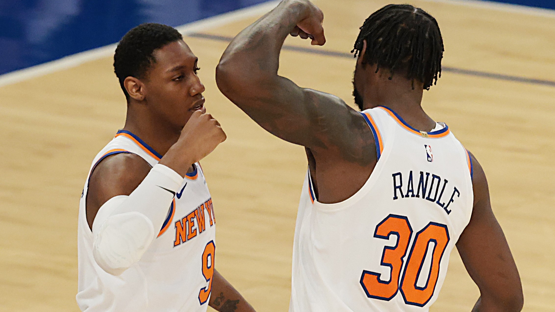 May 16, 2021; New York, New York, USA; New York Knicks forward Julius Randle (30) celebrates with guard RJ Barrett (9) during the first half against the Boston Celtics at Madison Square Garden. Mandatory Credit: Vincent Carchietta-USA TODAY Sports / Vincent Carchietta-USA TODAY Sports
