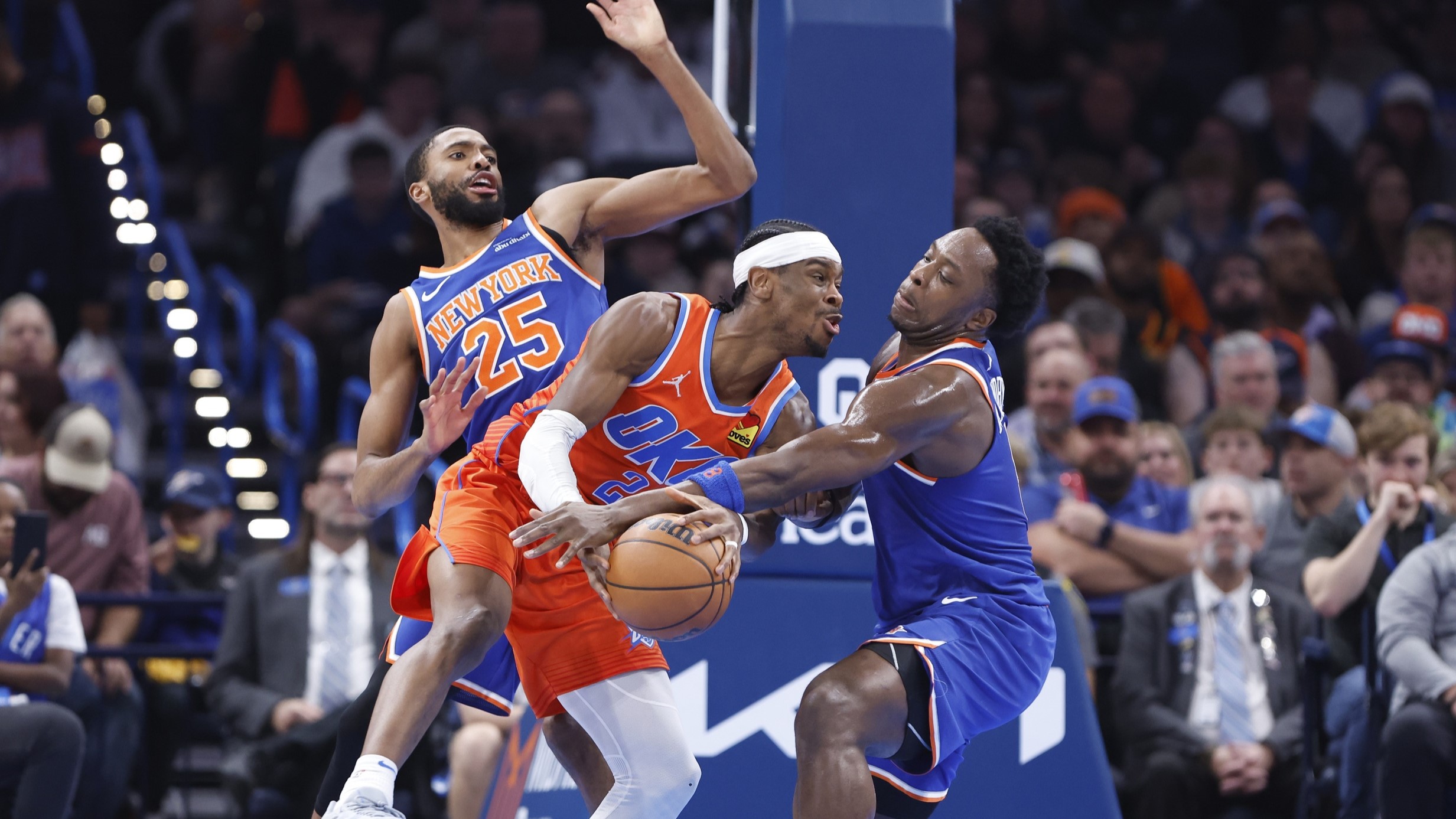 Knicks' nine-game win streak ends with frustrating 117-107 loss to ThunderNew York blew 12-point halftime lead, outscored 63-41 in second half1/4/2025, 3:43 AMTom HanslinFreelance Editorial ProducerJan 3, 2025; Oklahoma City, Oklahoma, USA; New York Knicks forward OG Anunoby (8) defends a drive by Oklahoma City Thunder guard Shai Gilgeous-Alexander (2) during the second quarter at Paycom Center. / Alonzo Adams-Imagn Images
