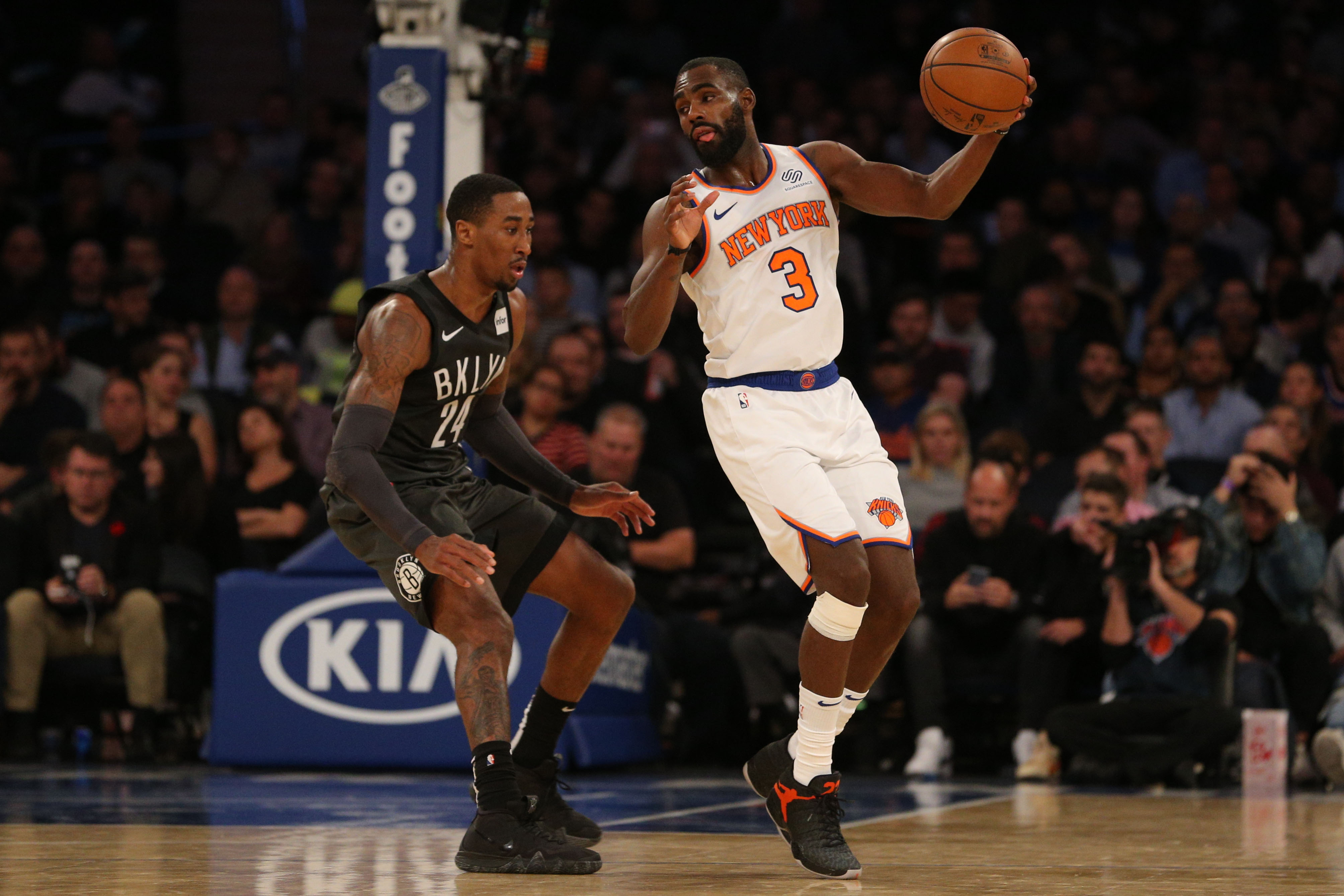 Oct 29, 2018; New York, NY, USA; New York Knicks guard Tim Hardaway Jr. (3) controls the ball against Brooklyn Nets forward Rondae Hollis-Jefferson (24) during the fourth quarter at Madison Square Garden. Mandatory Credit: Brad Penner-USA TODAY Sports / Brad Penner