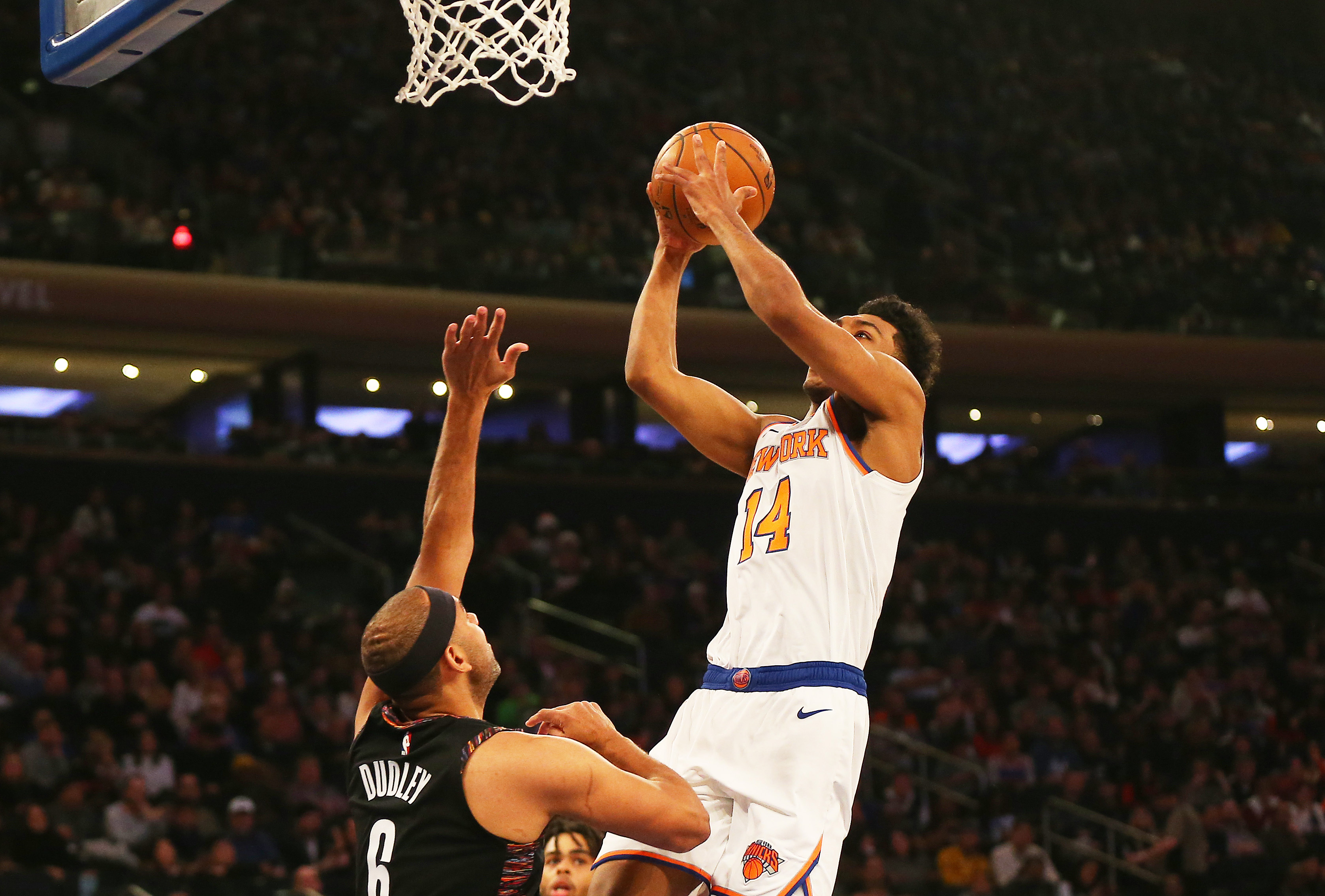 New York Knicks guard Allonzo Trier takes a shot while being defended by Brooklyn Nets forward Jared Dudley during the first half at Madison Square Garden. / Andy Marlin/USA TODAY Sports