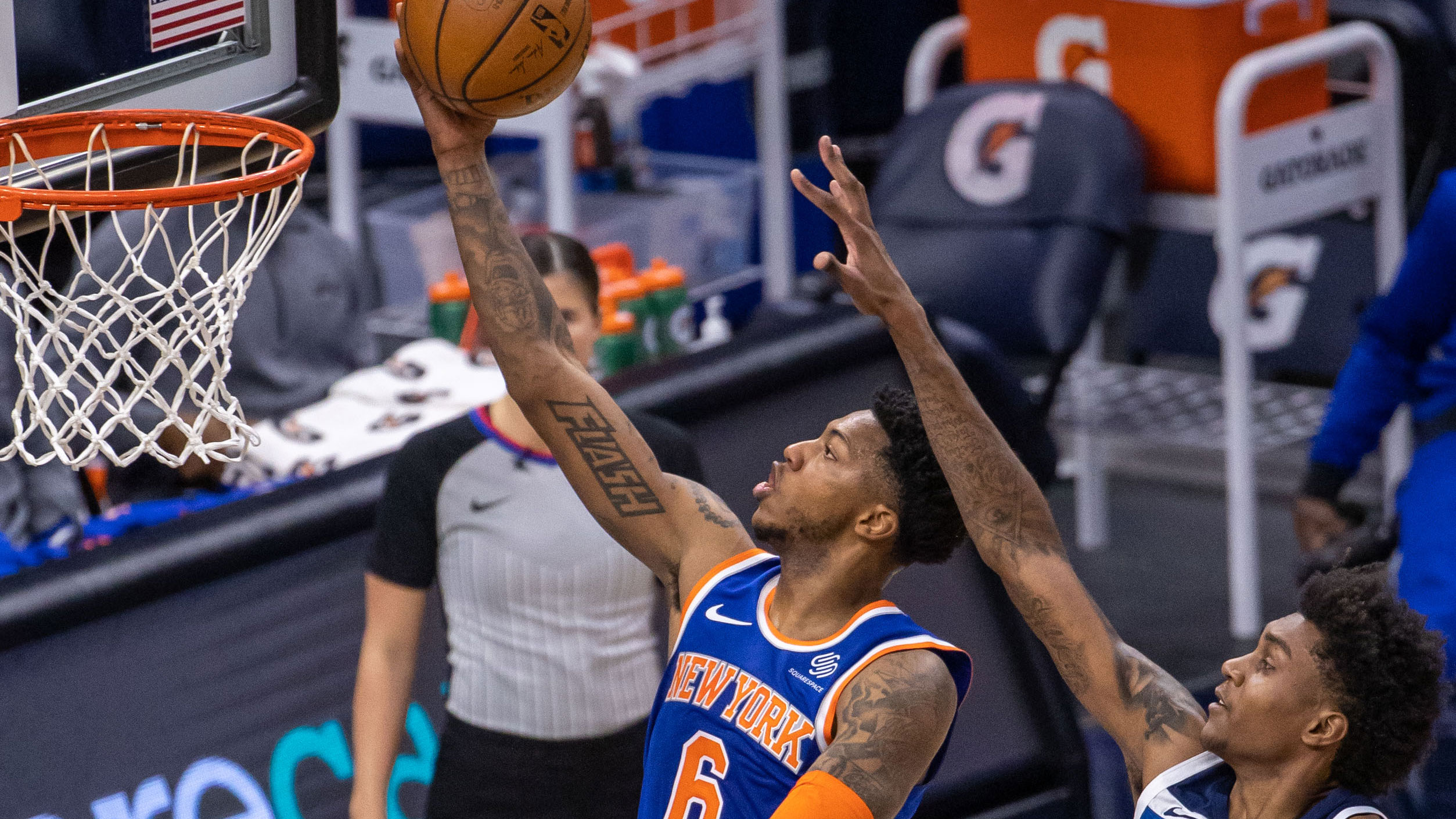 Mar 31, 2021; Minneapolis, Minnesota, USA; New York Knicks guard Elfrid Payton (6) drives to the basket and shoots the ball as Minnesota Timberwolves forward Jaden McDaniels (3) plays defense in the first half at Target Center. / Jesse Johnson-USA TODAY Sports