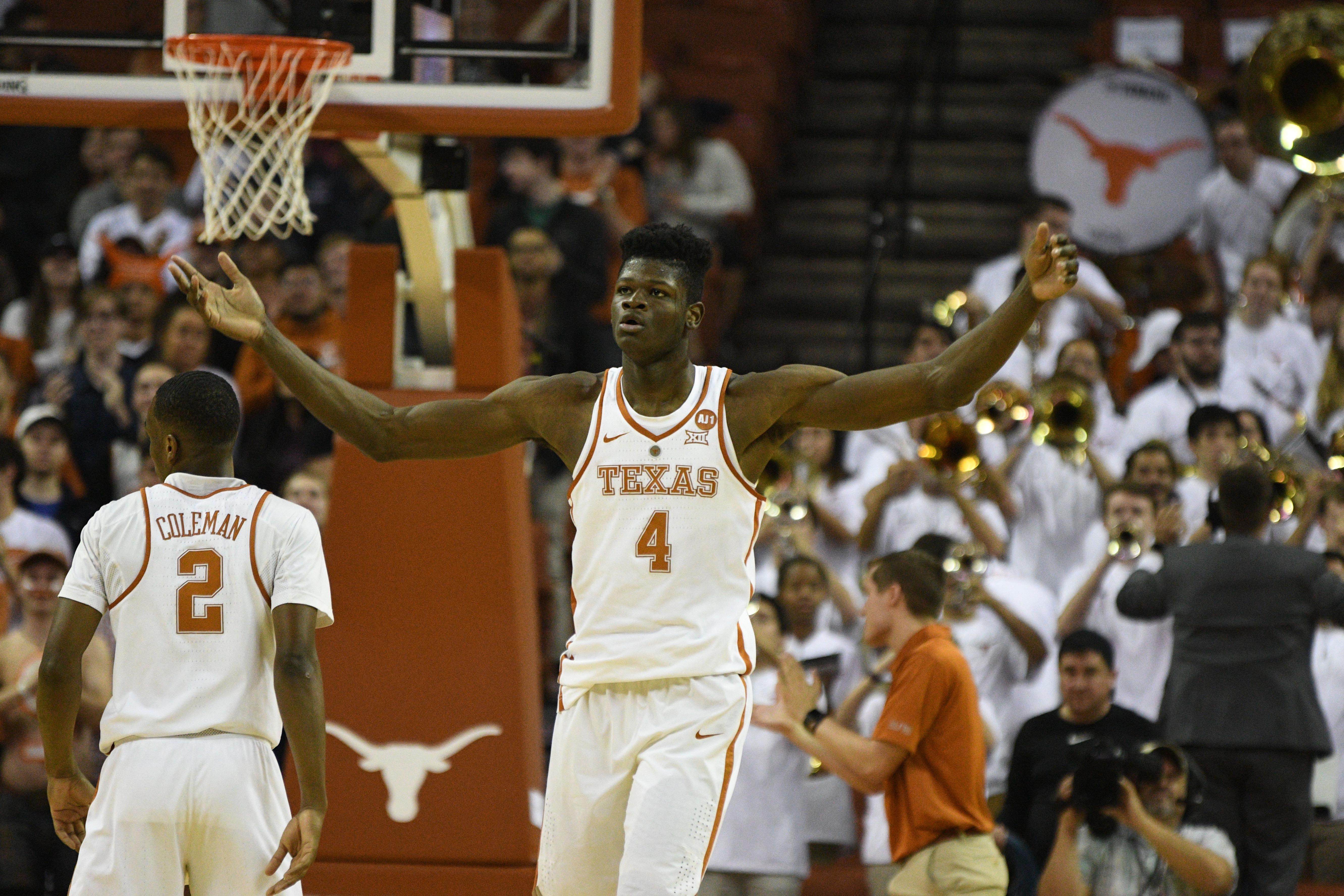 Jan 22, 2018; Austin, TX, USA; Texas Longhorns forward Mohamed Bamba (4) reacts against the Iowa State Cyclones during the second half at the Frank Erwin Center. The Longhorns won 73-57. Mandatory Credit: Brendan Maloney-USA TODAY Sports / Brendan Maloney