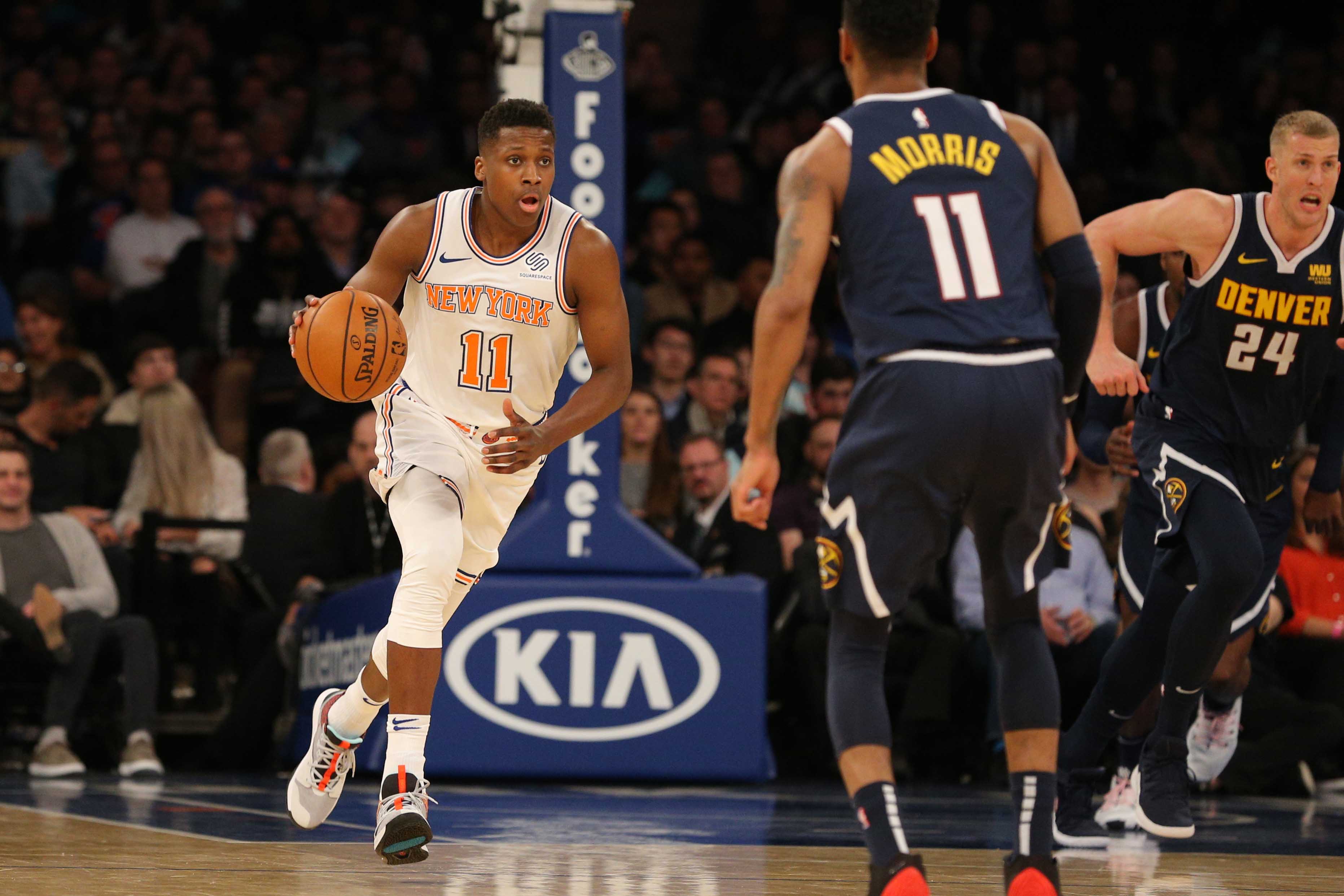 Mar 22, 2019; New York, NY, USA; New York Knicks point guard Frank Ntilikina (11) brings the ball up court against the Denver Nuggets during the fourth quarter at Madison Square Garden. Mandatory Credit: Brad Penner-USA TODAY Sports / Brad Penner