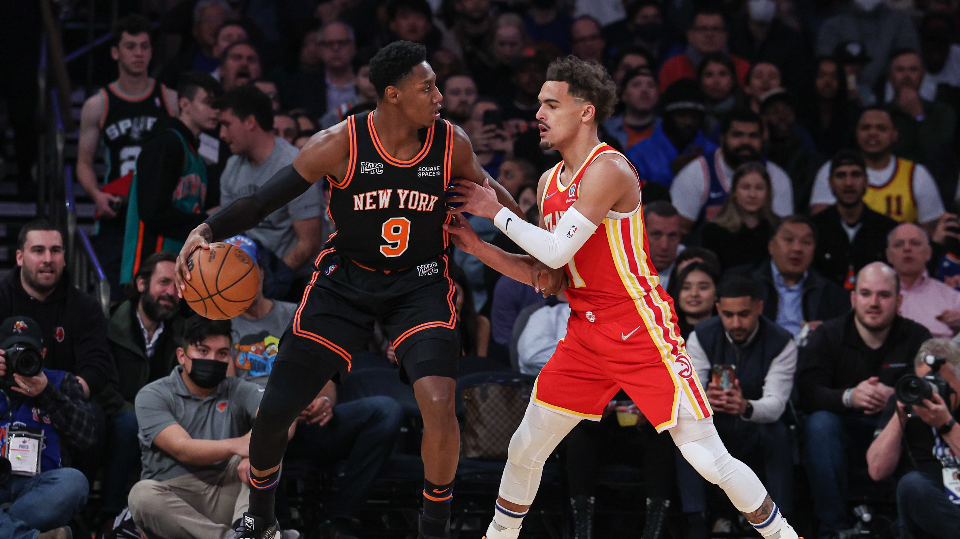 Mar 22, 2022; New York, New York, USA; New York Knicks guard RJ Barrett (9) dribbles against Atlanta Hawks guard Trae Young (11) during the first quarter at Madison Square Garden. / Vincent Carchietta-USA TODAY Sports