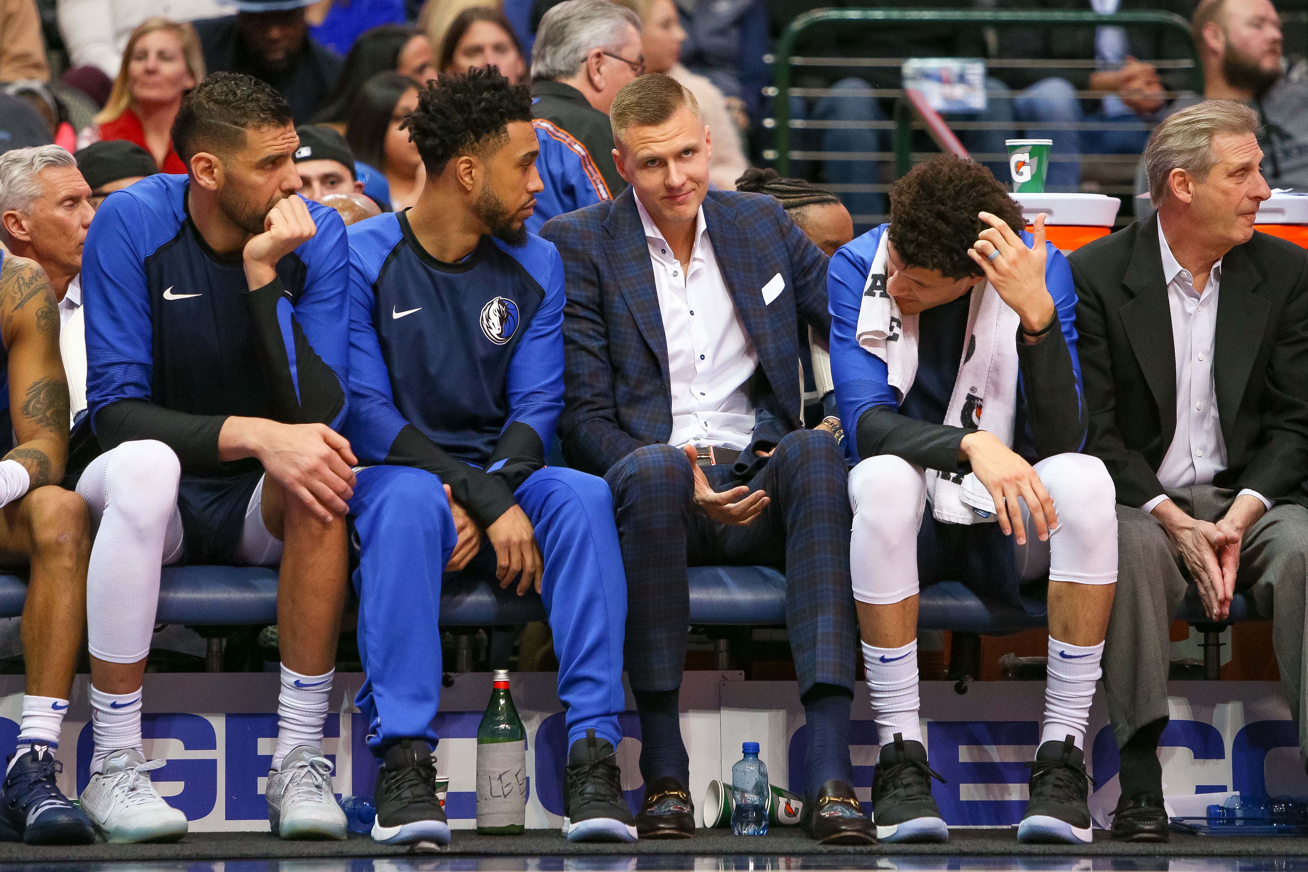 Mar 2, 2019; Dallas, TX, USA; Dallas Mavericks forward Kristaps Porzingis (6) looks on from the bench during the game against the Memphis Grizzlies at American Airlines Center. Mandatory Credit: Andrew Dieb-USA TODAY Sports / Andrew Dieb