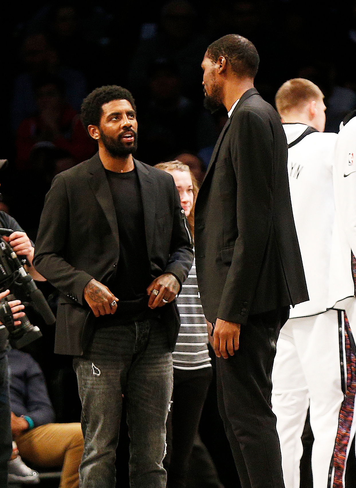 Nov 29, 2019; Brooklyn, NY, USA; Brooklyn Nets injured players Kyrie Irving (left) and Kevin Durant talk during a timeout against Boston Celtics during the second half at Barclays Center. Mandatory Credit: Andy Marlin-USA TODAY Sportsundefined
