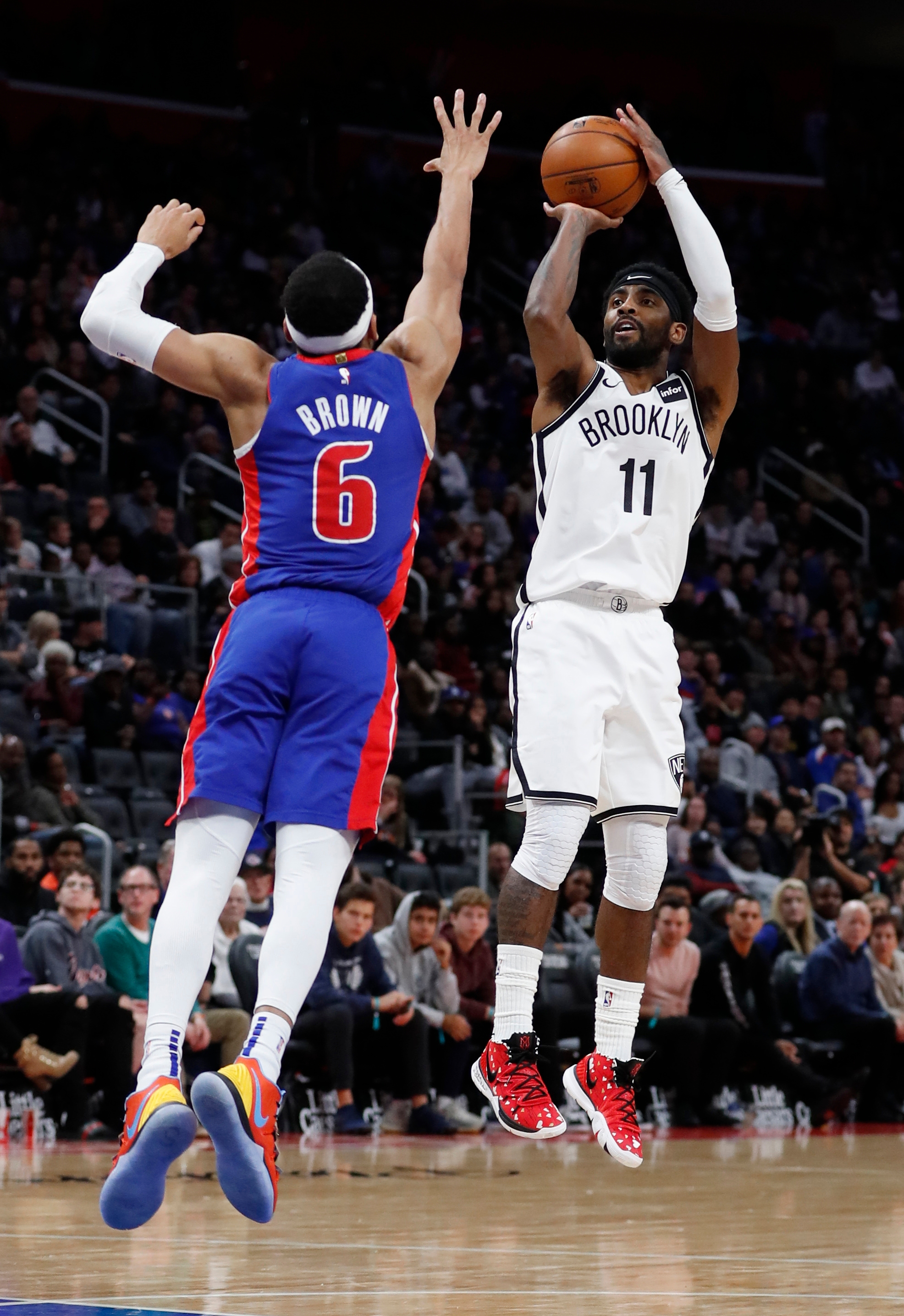 Nov 2, 2019; Detroit, MI, USA; Brooklyn Nets guard Kyrie Irving (11) shoots on Detroit Pistons guard Bruce Brown (6) in the second half at Little Caesars Arena. Mandatory Credit: Rick Osentoski-USA TODAY Sports / Rick Osentoski