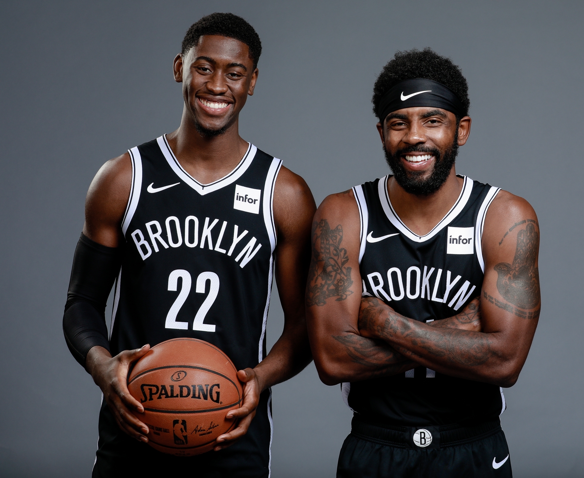Sep 27, 2019; Brooklyn, NY, USA; Brooklyn Nets guard Caris LeVert (22) and Brooklyn Nets guard Kyrie Irving (11) pose for a portrait during media day at HSS Training Center. Mandatory Credit: Nicole Sweet-USA TODAY Sports / NICOLE SWEET