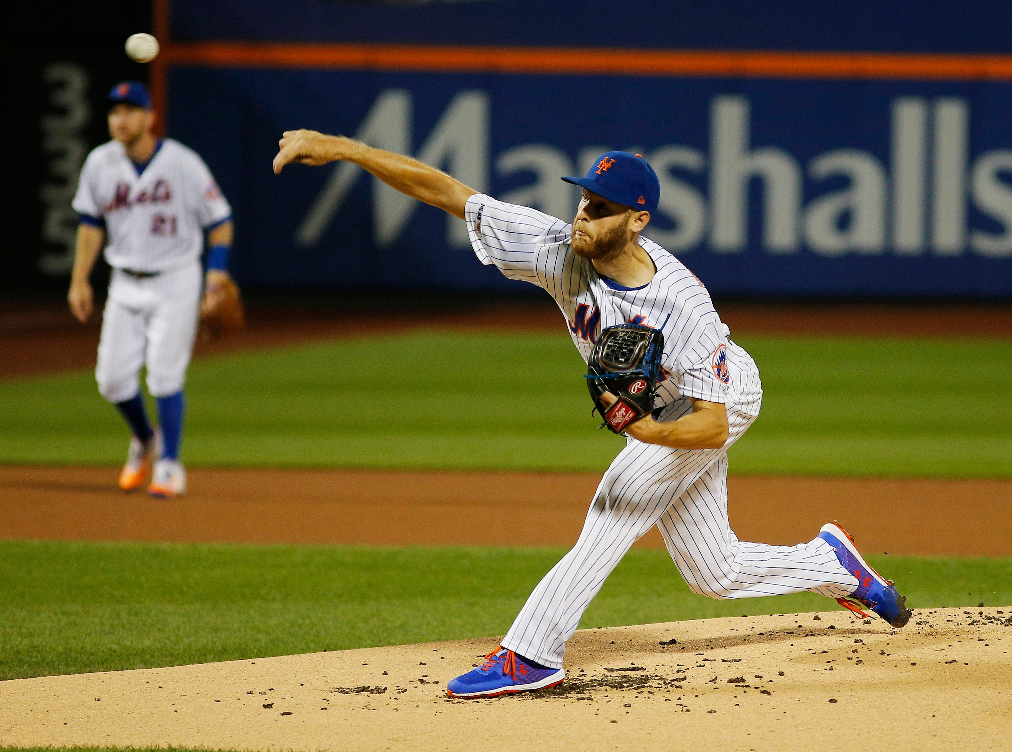 Sep 26, 2019; New York City, NY, USA; New York Mets starting pitcher Zack Wheeler (45) pitches against the Miami Marlins during the first inning at Citi Field. Mandatory Credit: Andy Marlin-USA TODAY Sportsundefined