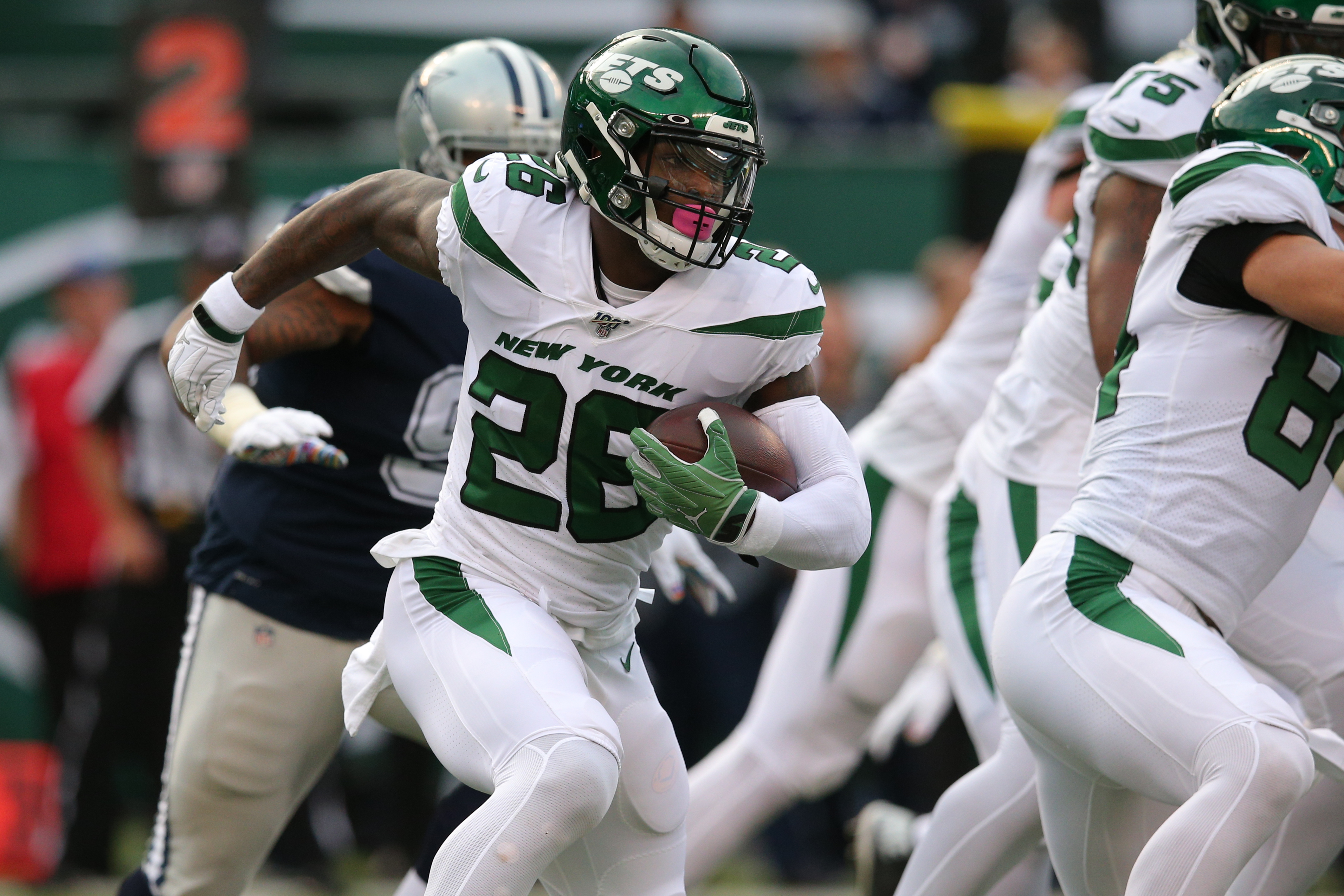 Oct 13, 2019; East Rutherford, NJ, USA; New York Jets running back Le'Veon Bell (26) runs the ball against the Dallas Cowboys during the first quarter at MetLife Stadium. Mandatory Credit: Brad Penner-USA TODAY Sportsundefined