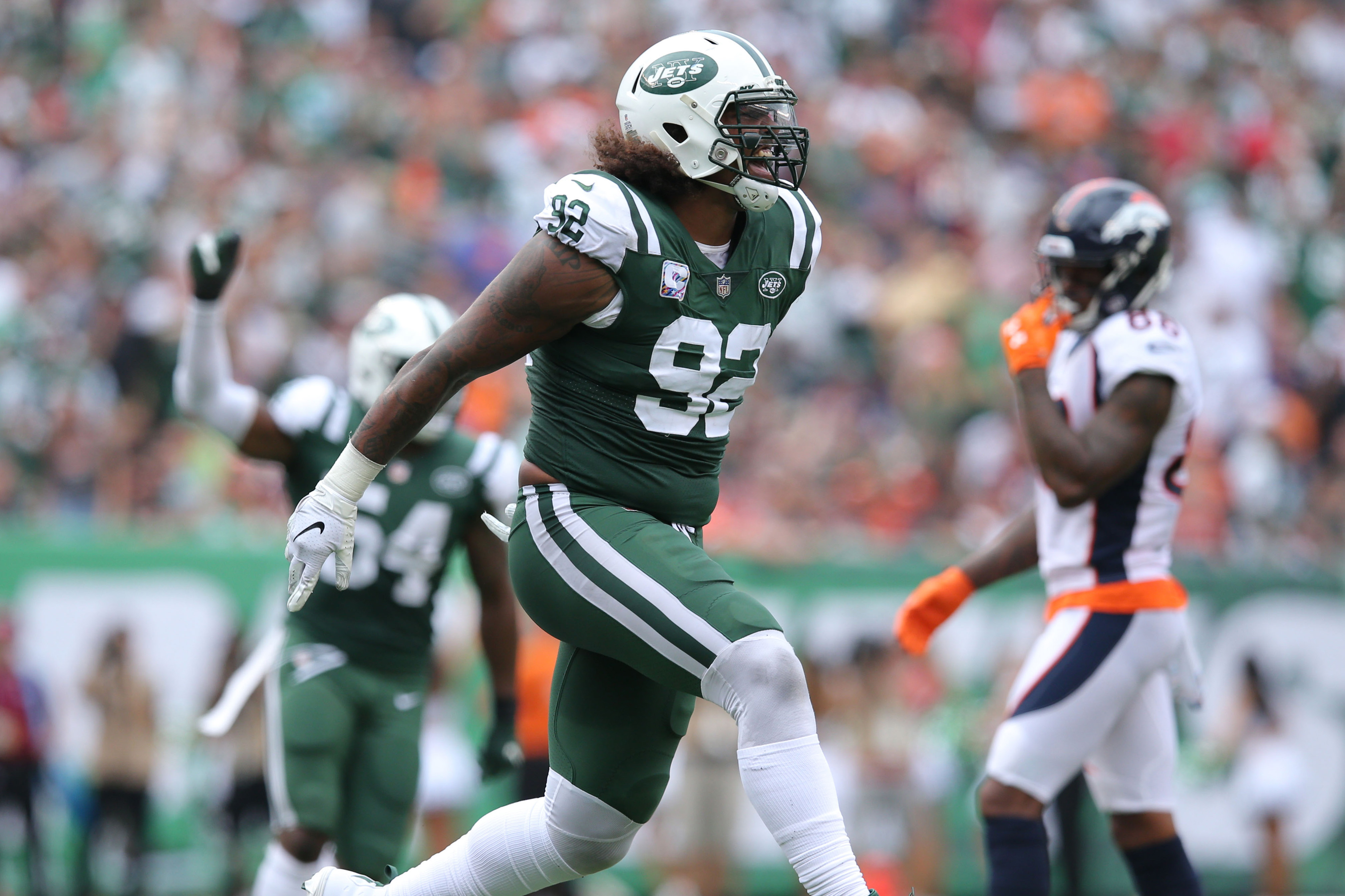 Oct 7, 2018; East Rutherford, NJ, USA; New York Jets defensive end Leonard Williams (92) celebrates a sack against the Denver Broncos during the second quarter at MetLife Stadium. Mandatory Credit: Brad Penner-USA TODAY Sports / Brad Penner