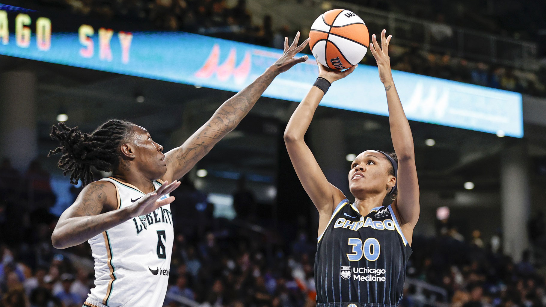 Aug 17, 2022; Chicago, Illinois, USA; Chicago Sky forward Azura Stevens (30) shoots the ball against New York Liberty forward Natasha Howard (6) during the first half of game one of the first round of the WNBA playoffs at Wintrust Arena. / Kamil Krzaczynski-USA TODAY Sports