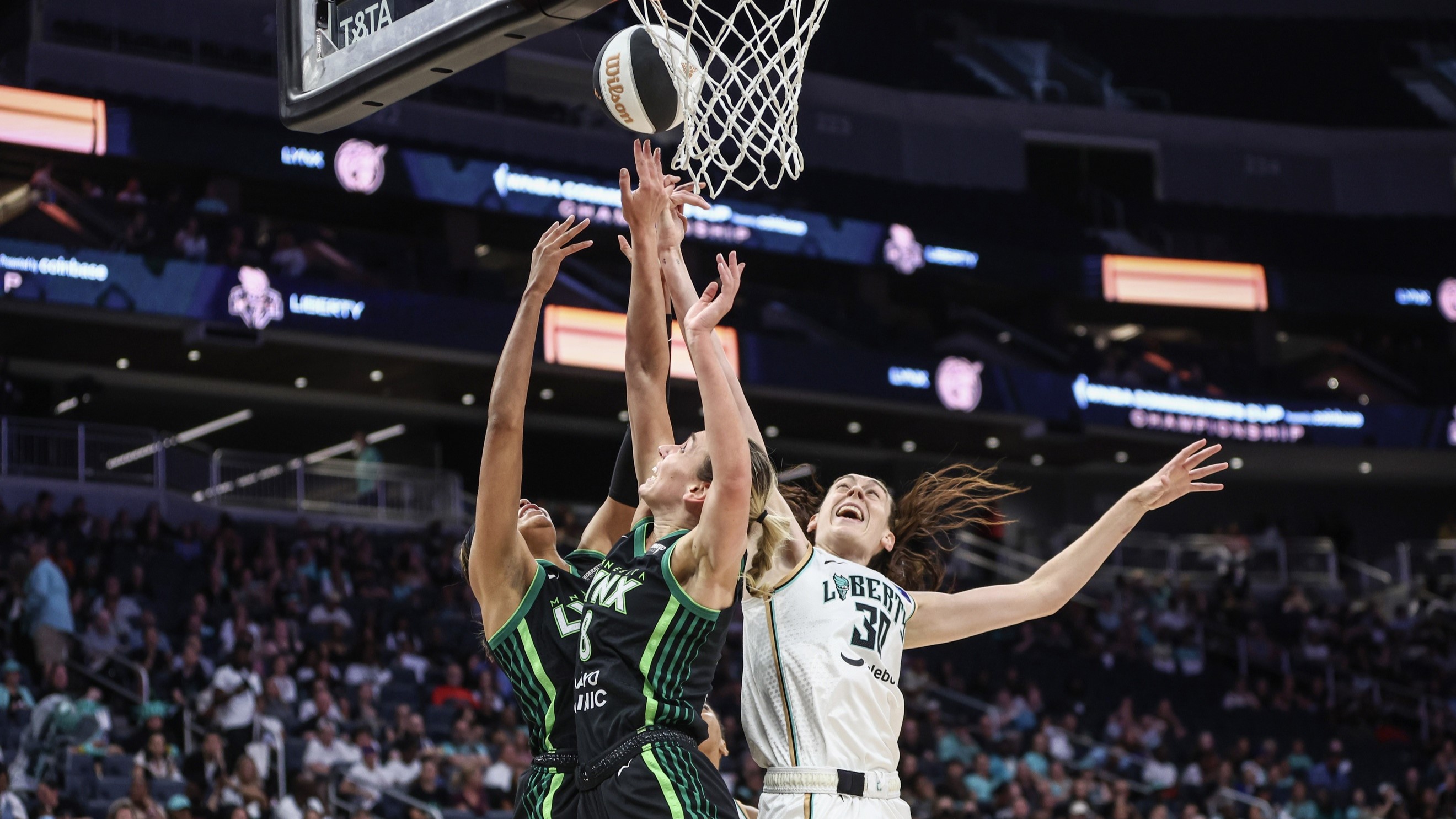 Jun 25, 2024; Belmont Park, New York, USA; Minnesota Lynx forward Alanna Smith (8) and New York Liberty forward Breanna Stewart (30) battle for a rebound in the first quarter of the Commissioner’s Cup Championship game at UBS Arena. / Wendell Cruz-USA TODAY Sports