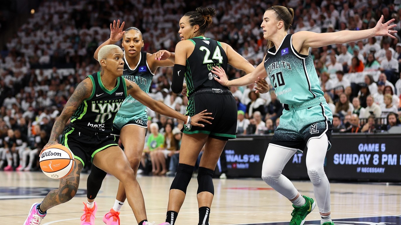 Oct 18, 2024; Minneapolis, Minnesota, USA; Minnesota Lynx guard Courtney Williams (10) drives toward the basket as New York Liberty forward Betnijah Laney-Hamilton (44) and guard Sabrina Ionescu (20) defend during the first half of game four of the 2024 WNBA Finals at Target Center. / Matt Krohn-Imagn Images
