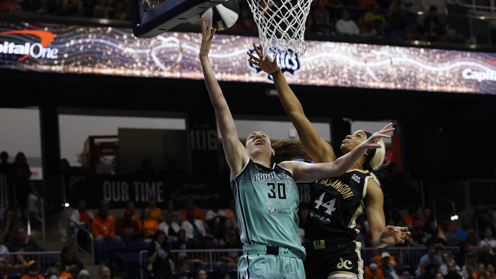 Jun 5, 2025; Washington, District of Columbia, USA; New York Liberty forward Breanna Stewart (30) shoots the ball while being fouled by Washington Mystics forward Kiki Iriafen (44) in the first half at Entertainment & Sports Arena. / Geoff Burke-Imagn Images