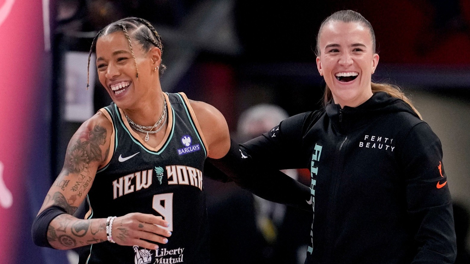 New York Liberty's Sabrina Ionescu (20) celebrates with New York Liberty's Natasha Cloud (9) on Friday, July 18, 2025, after Cloud won the WNBA All-Star skills contest at Gainbridge Fieldhouse in Indianapolis. / Grace Hollars/IndyStar / USA TODAY NETWORK via Imagn Images
