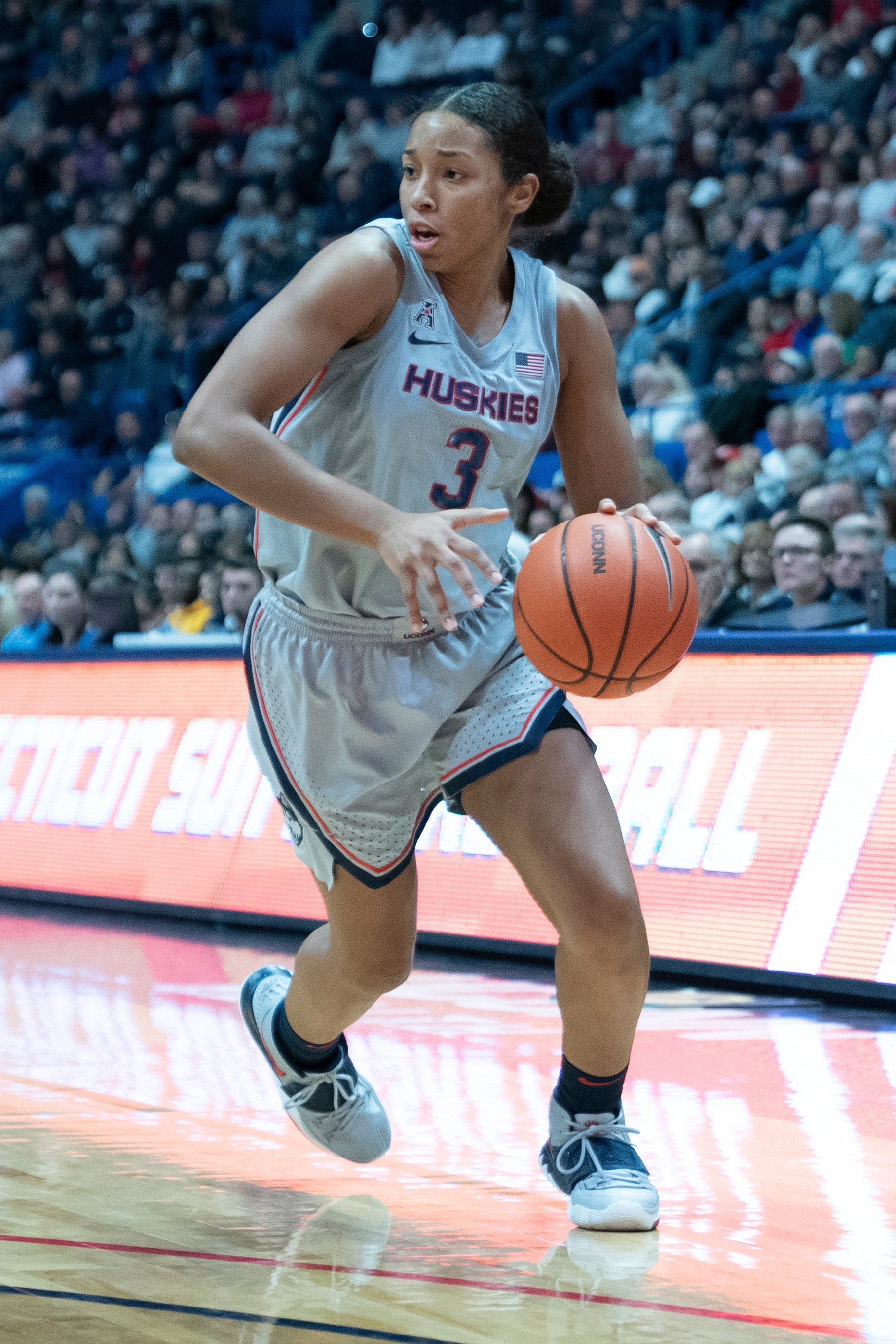 Jan 9, 2020; Hartford, Connecticut, USA; Connecticut Huskies forward Megan Walker (3) dribbles the ball against the Baylor Bears during the first half at XL Center. Mandatory Credit: Gregory Fisher-USA TODAY Sports / Gregory Fisher