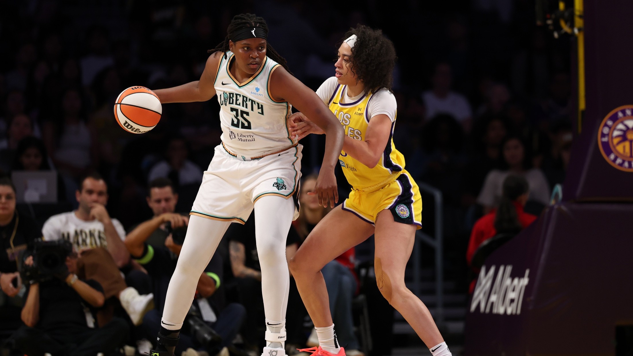 Jonquel Jones' double-double leads Liberty to 105-97 win over SparksLiberty shot 56 percent from the field8/13/2025, 4:27 AMAssociated PressAug 12, 2025; Los Angeles, California, USA; New York Liberty center Jonquel Jones (35) posts up against Los Angeles Sparks forward Dearica Hamby (5) during the first quarter at Crypto.com Arena. / Kiyoshi Mio-Imagn Images