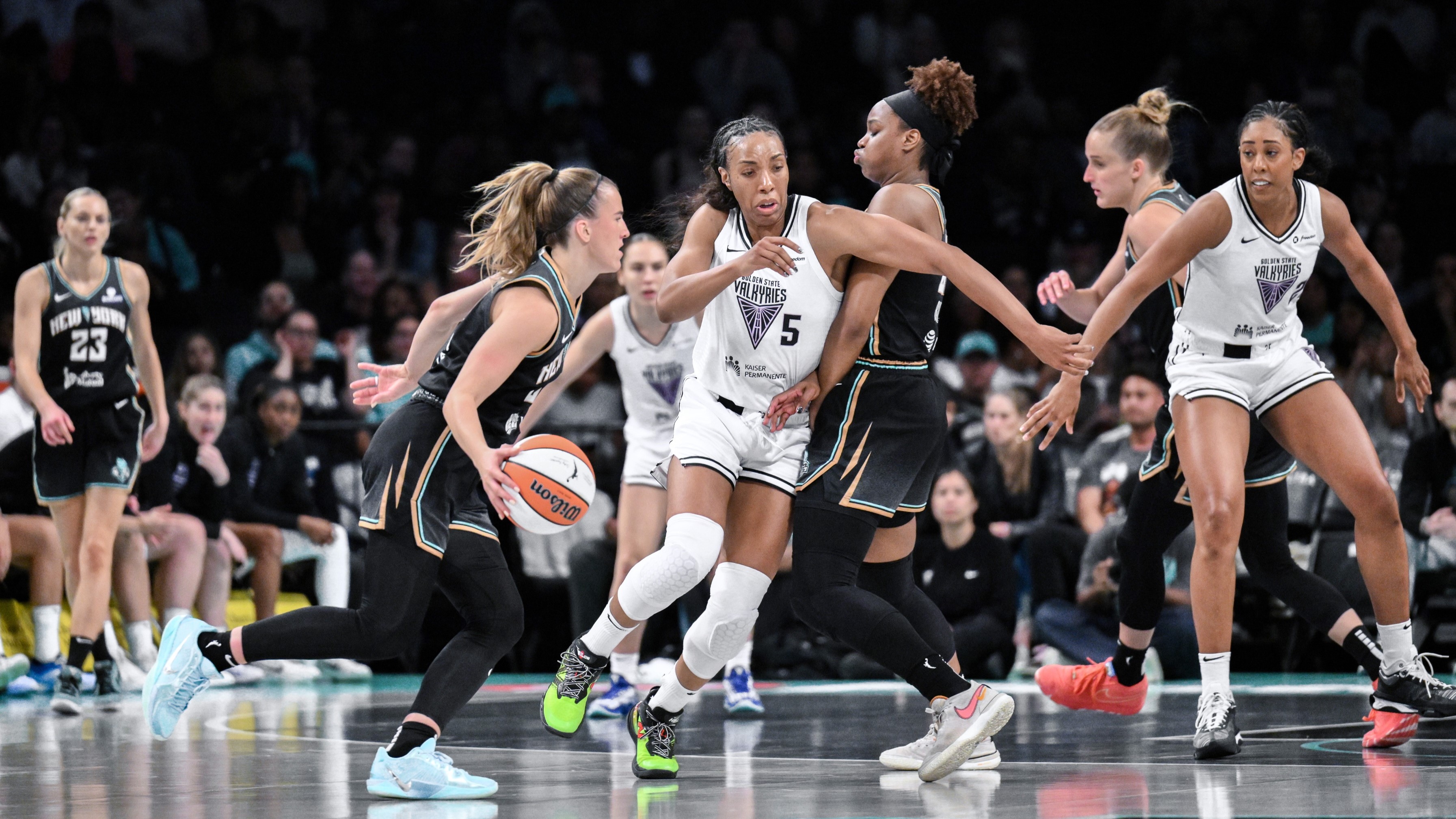 Liberty hold on for 82-77 win over Valkyries to remain undefeatedLiberty start season 5-0 for first time since 20075/30/2025, 1:19 AMPhillip MartinezEditorial ProducerMay 29, 2025; Brooklyn, New York, USA; Golden State Valkyries forward Kayla Thornton (5) defends against New York Liberty guard Sabrina Ionescu (20) during the first half at Barclays Center. / John Jones-Imagn Images