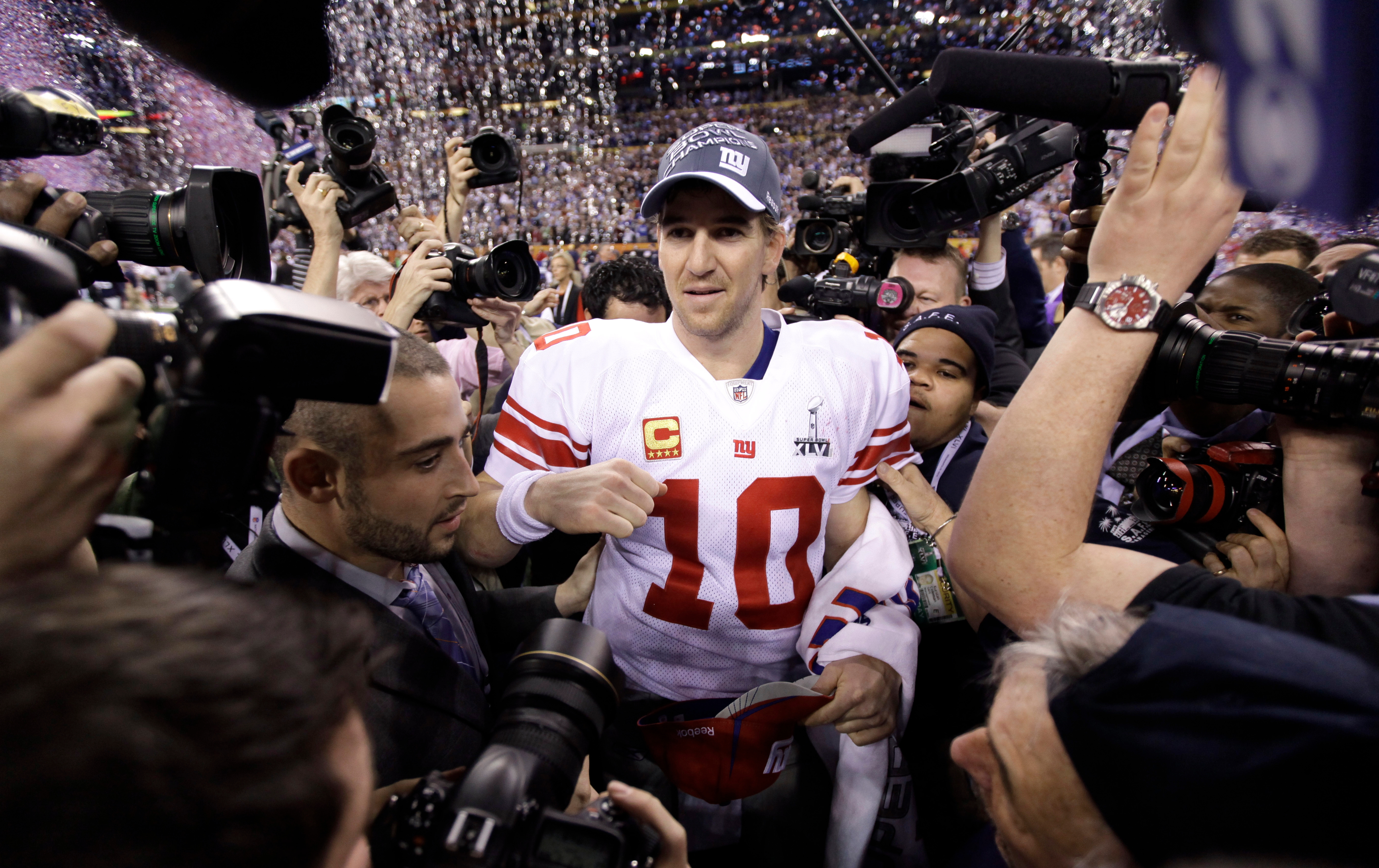 New York Giants quarterback Eli Manning, center, is surrounded by photographers as he celebrates his team's 21-17 win against New England Patriots after the NFL Super Bowl XLVI football game Sunday, Feb. 5, 2012, in Indianapolis. (AP Photo/Marcio Jose Sanchez) / Marcio Jose Sanchez/AP