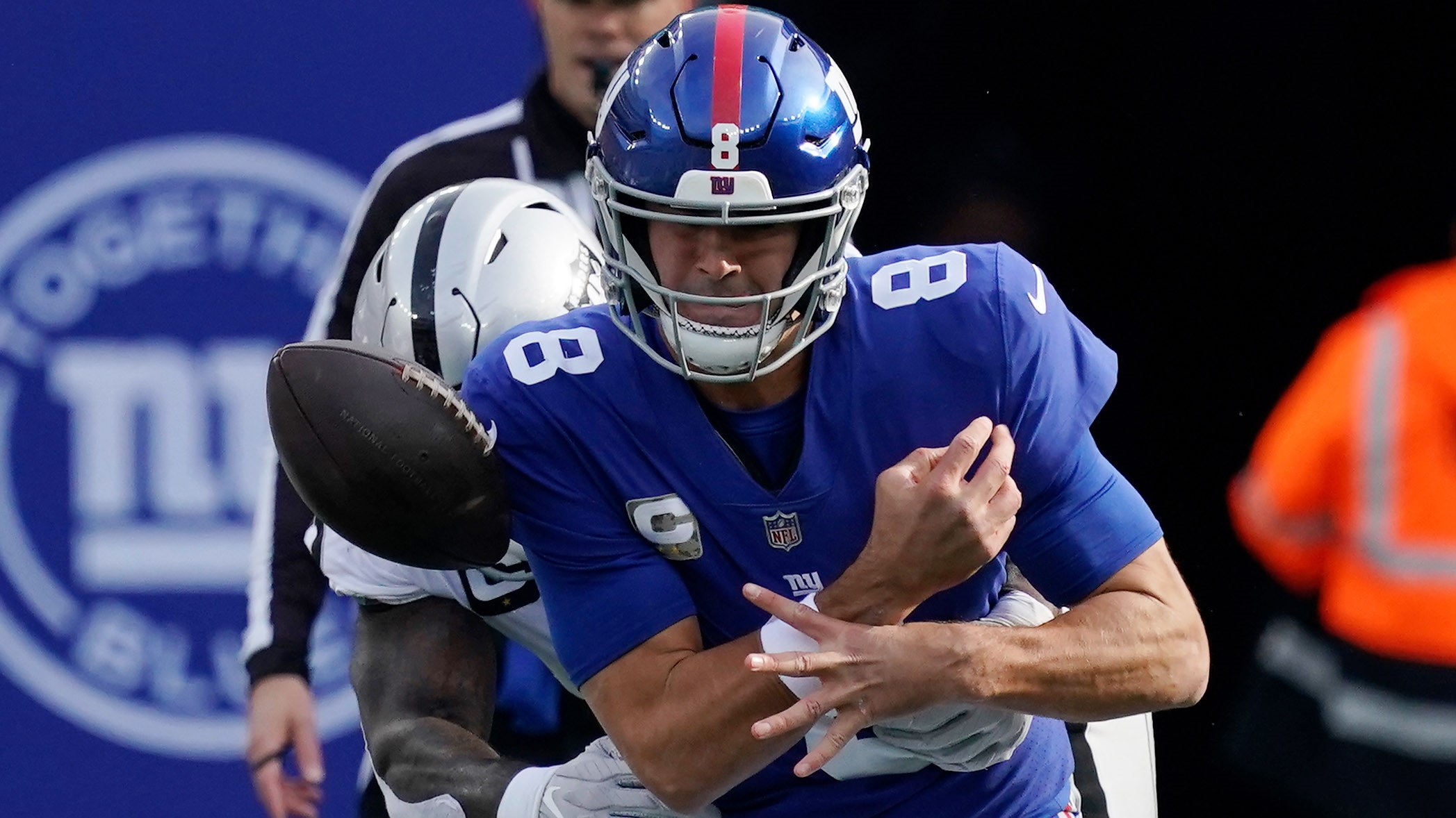 ov 7, 2021; East Rutherford, N.J., USA; Las Vegas Raiders defensive end Yannick Ngakoue (91) sacks New York Giants quarterback Daniel Jones (8) and causes a fumble that the Raiders recovered in the first half at MetLife Stadium. / Robert Deutsch-USA TODAY Sports