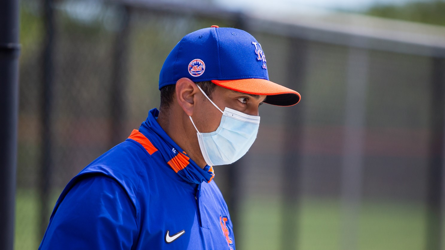 New York Mets manager Luis Rojas (19) watches batting practice during spring training at Clover Park. / Mary Holt
