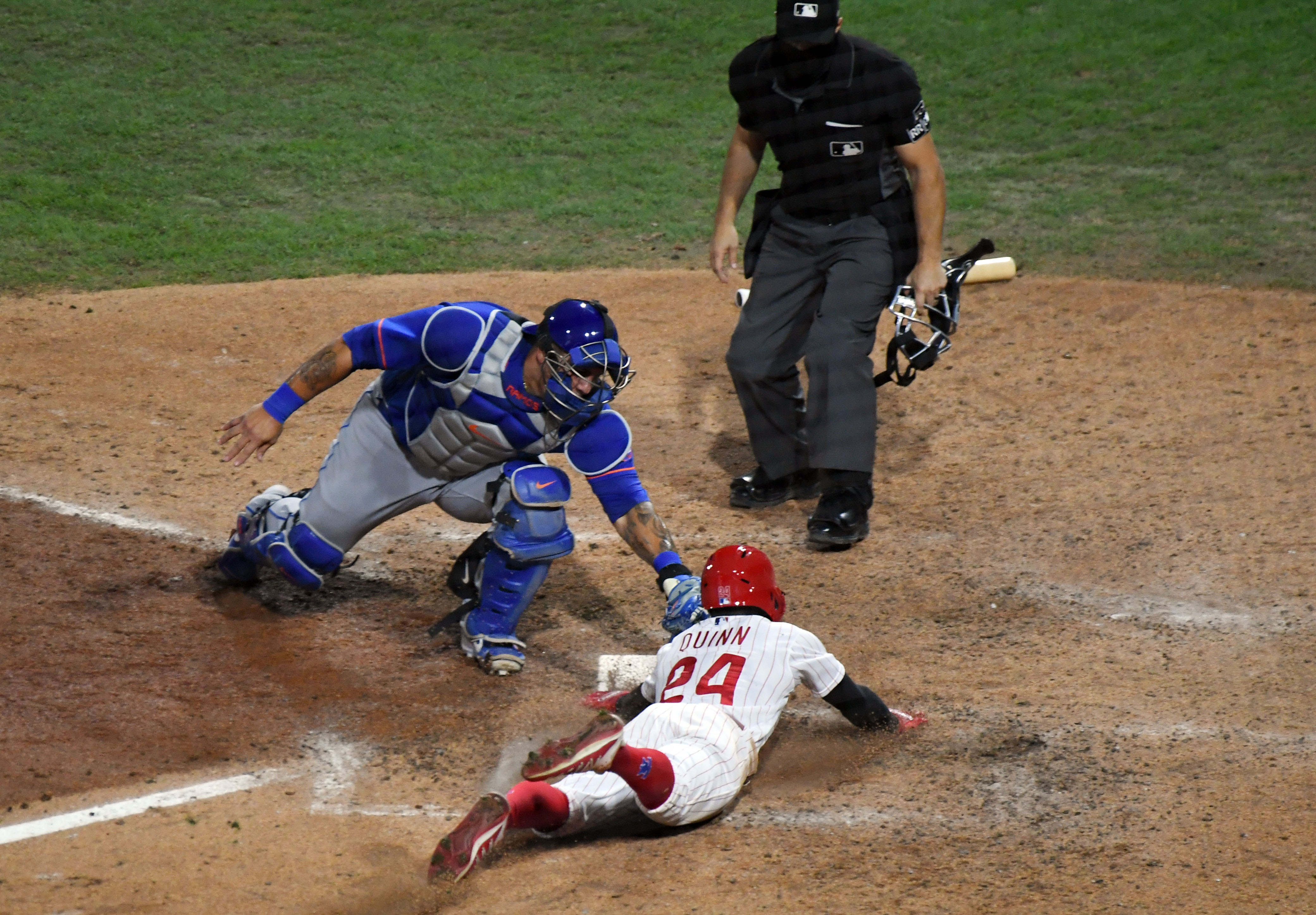 Aug 14, 2020; Philadelphia, Pennsylvania, USA; Philadelphia Phillies center fielder Roman Quinn (24) slides safely into home plate as New York Mets catcher Wilson Ramos (40) is unable to make the tag in the bottom of the ninth inning at Citizens Bank Park. Mandatory Credit: James Lang-USA TODAY Sports