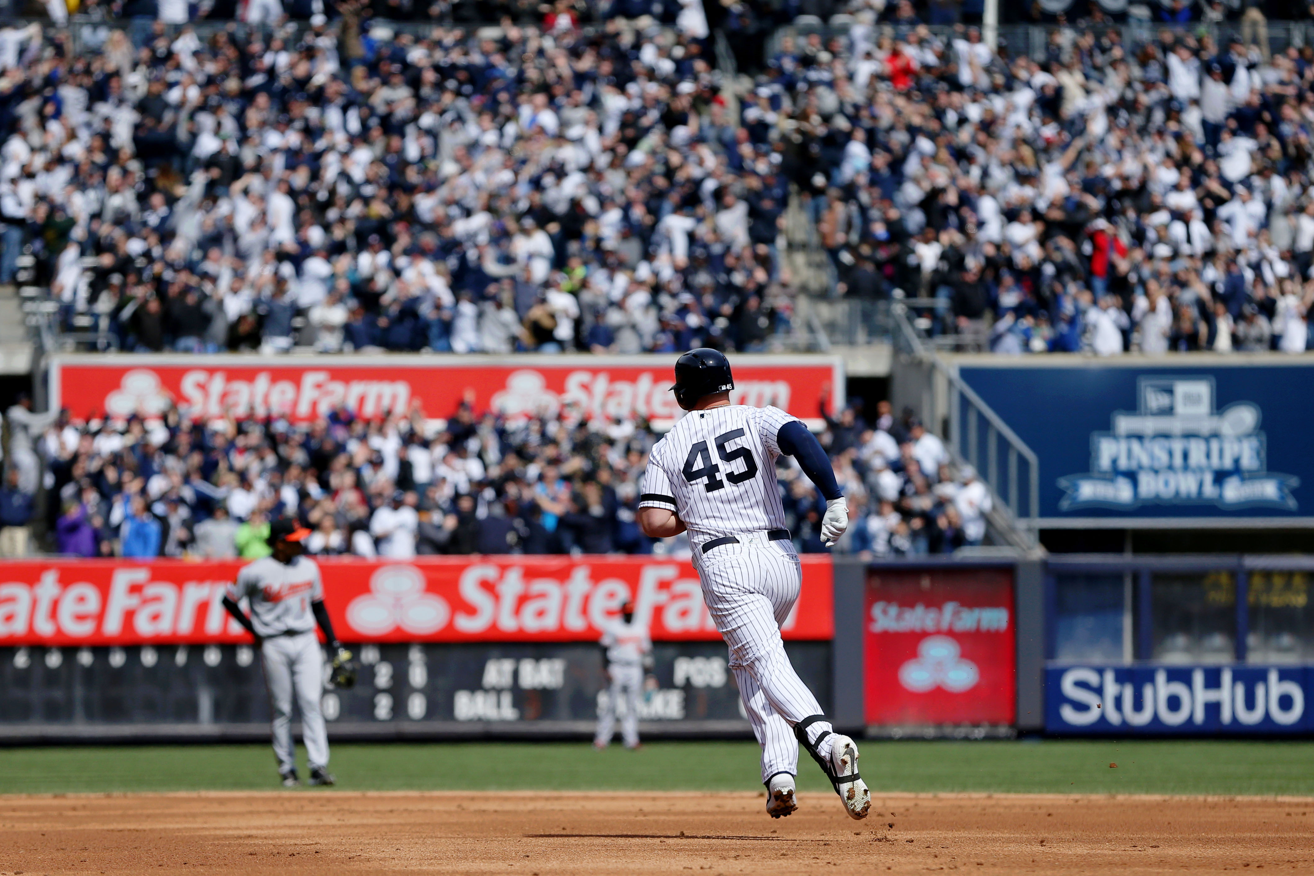 Mar 28, 2019; Bronx, NY, USA; New York Yankees designated hitter Luke Voit (45) rounds the bases after hitting a three run home run against the Baltimore Orioles during the first inning at Yankee Stadium. Mandatory Credit: Brad Penner-USA TODAY Sports / Brad Penner