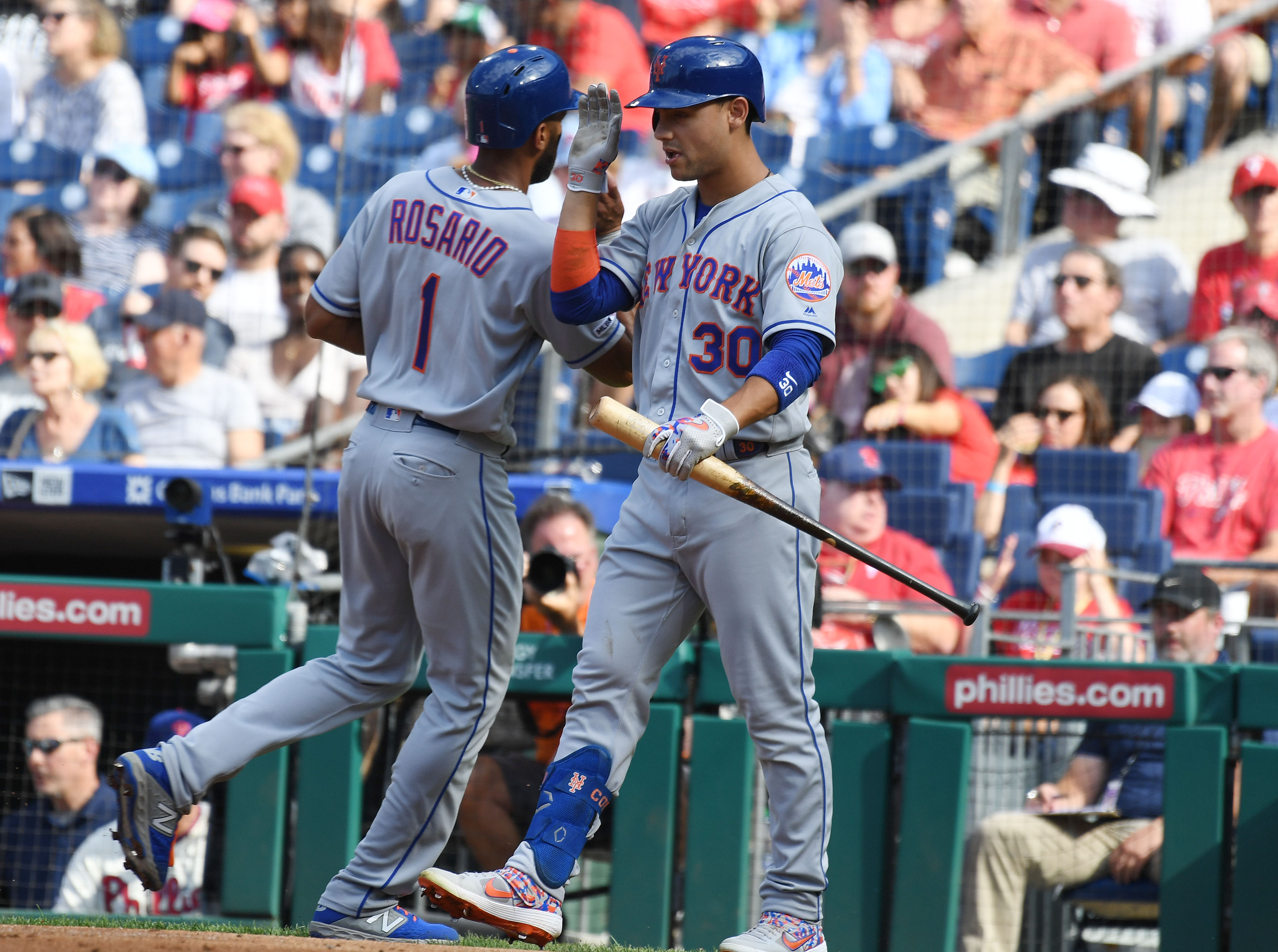 Aug 31, 2019; Philadelphia, PA, USA; New York Mets shortstop Amed Rosario (1) is congratulated by right fielder Michael Conforto (30) after scoring a run in the first inning against the New York Mets at Citizens Bank Park. Mandatory Credit: James Lang-USA TODAY Sports / James Lang