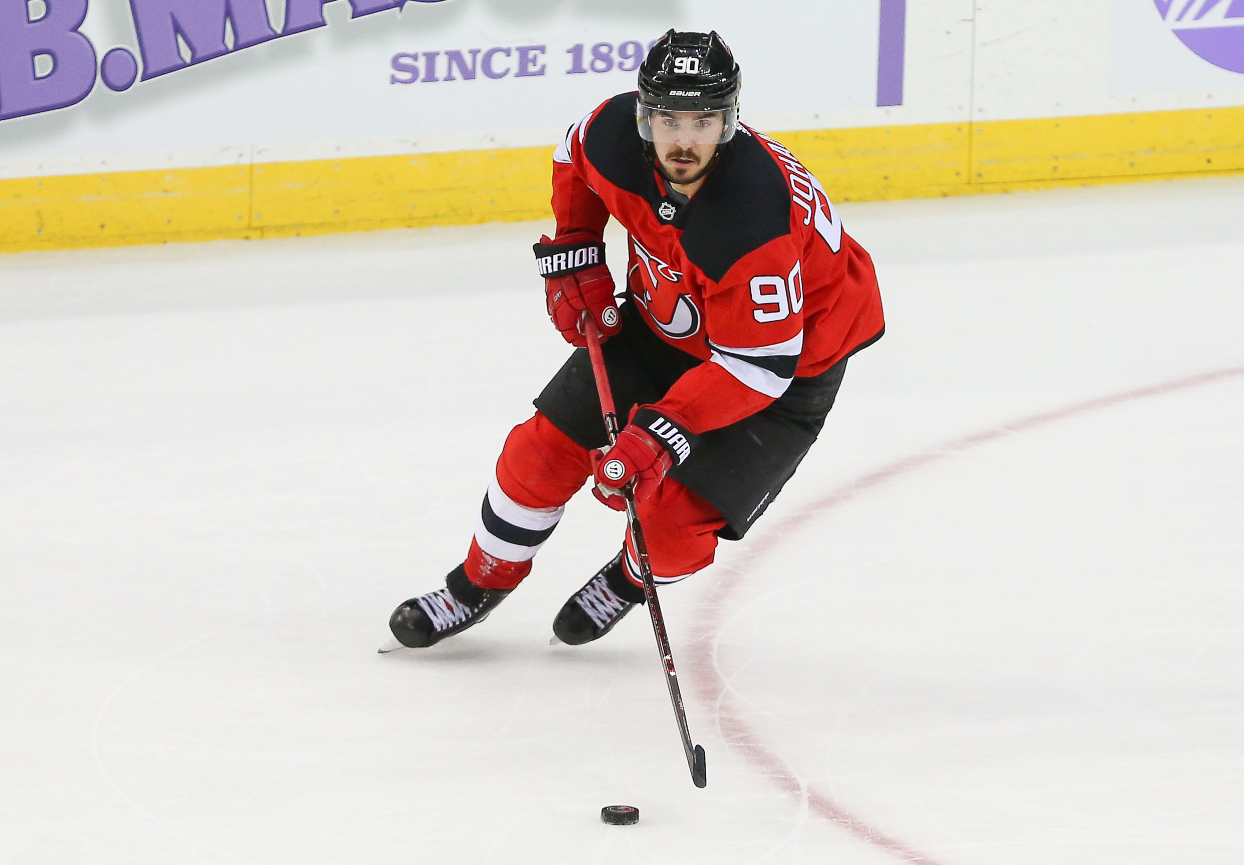 Nov 23, 2018; Newark, NJ, USA; New Jersey Devils left wing Marcus Johansson (90) carries the puck during the overtime against the New York Islanders at Prudential Center. Mandatory Credit: Vincent Carchietta-USA TODAY Sports / Vincent Carchietta